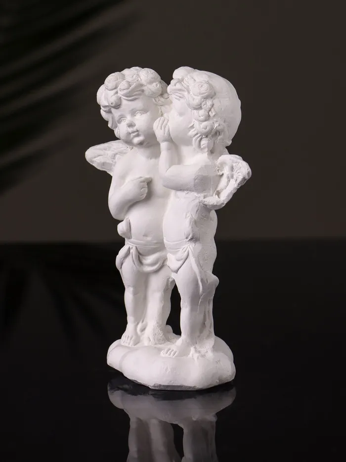 Погрузитесь в атмосферу волшебства и нежности с фигуркой, которая станет не только украшением вашего интерьера, но и символом дружбы и доверия. Два ангела, шепчущиеся друг с другом, выполнены из натурального гипса и имеют размеры 9×6.5×3.5 см, что делает их идеальным акцентом для любого пространства.