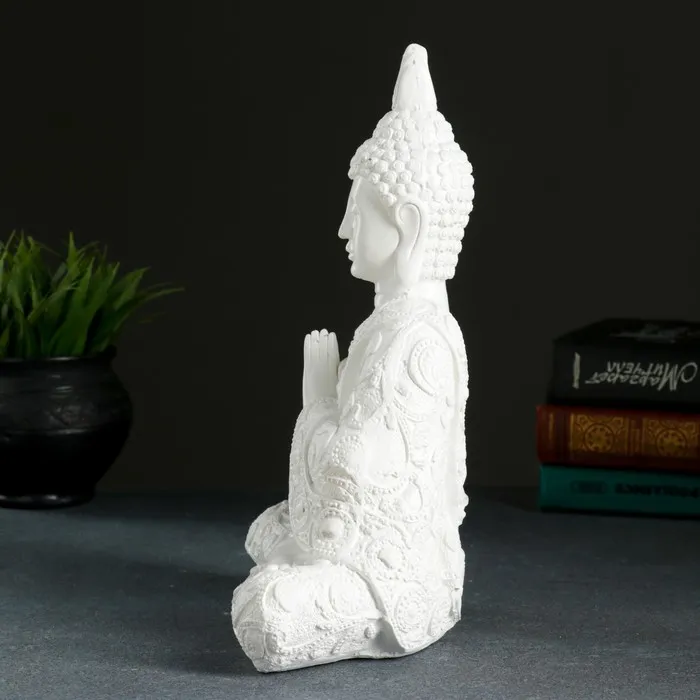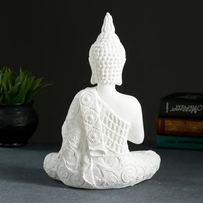 Белая гипсовая фигура с плавными линиями и умиротворённой позой — это воплощение гармонии и спокойствия в вашем пространстве. Её компактный размер (29 см в высоту) позволяет органично вписаться в интерьер, будь то полка в гостиной, рабочий кабинет или зона для медитации.