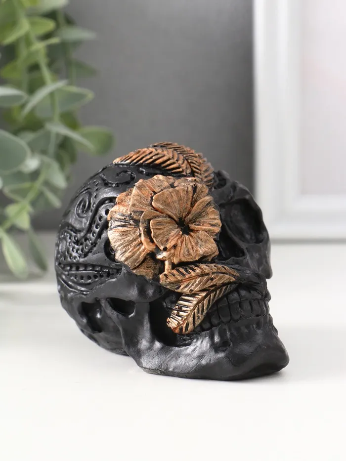 Эта чёрная гипсовая фигурка черепа с цветком станет выразительным акцентом для интерьера или тематической вечеринки. Сочетание готической эстетики и природной красоты создает глубокий визуальный контраст, притягивающий взгляд.