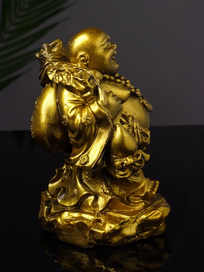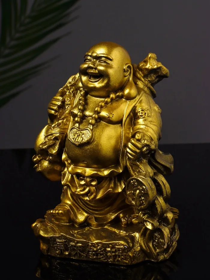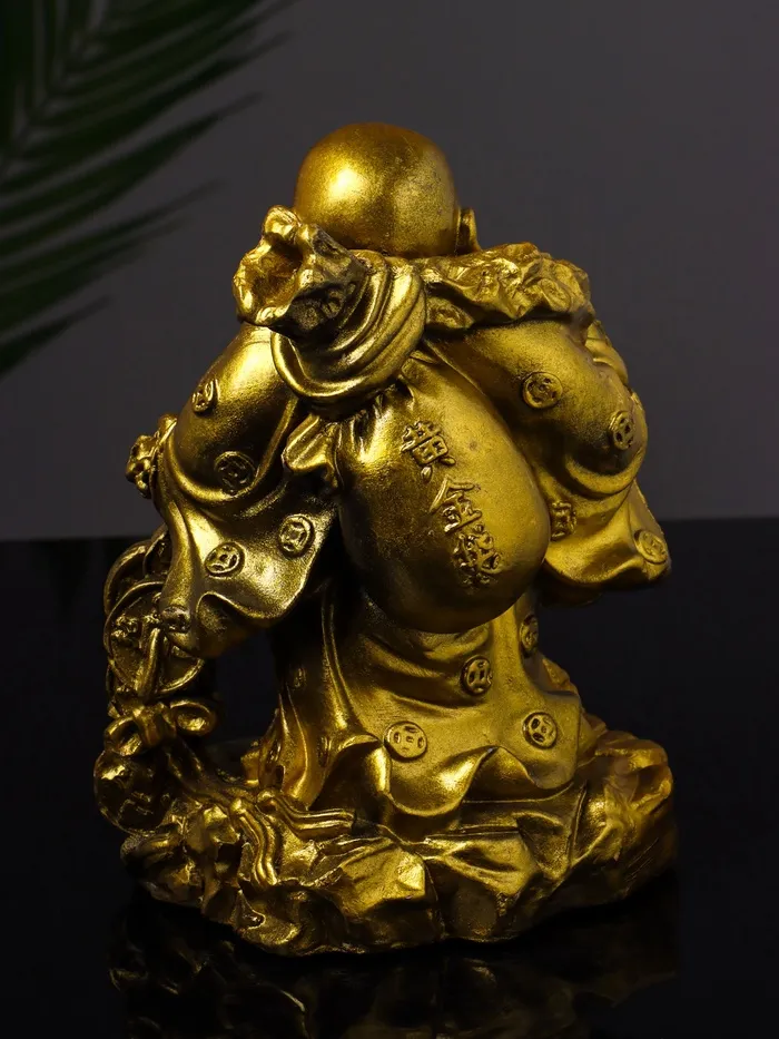 Каждая линия этого образа продумана до мелочей: добродушная улыбка, традиционные одеяния и характерная поза - всё говорит о глубине символики. Золотистое покрытие добавляет статусности, превращая фигурку в настоящий талисман благополучия.