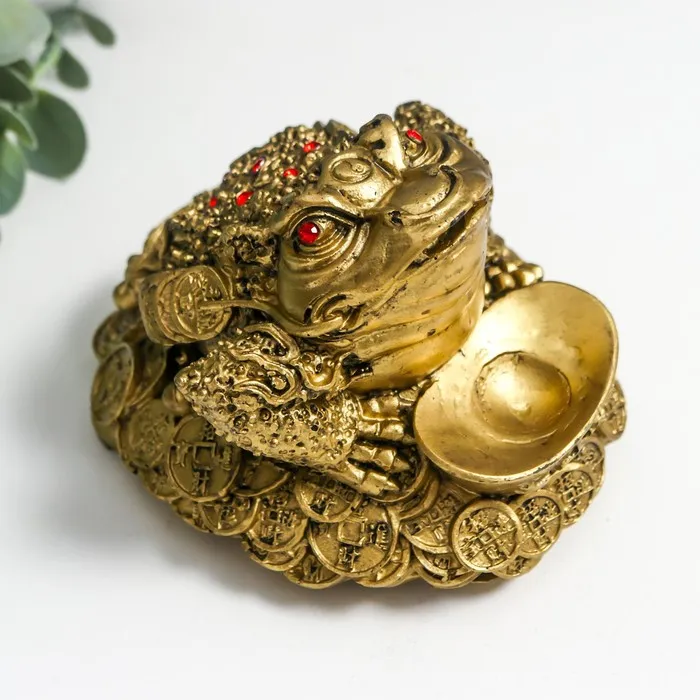 Нэцкэ фигурка «Денежная жаба на монетах и золотых слитках», полистоун, под бронзу, 7.5×9×11 см