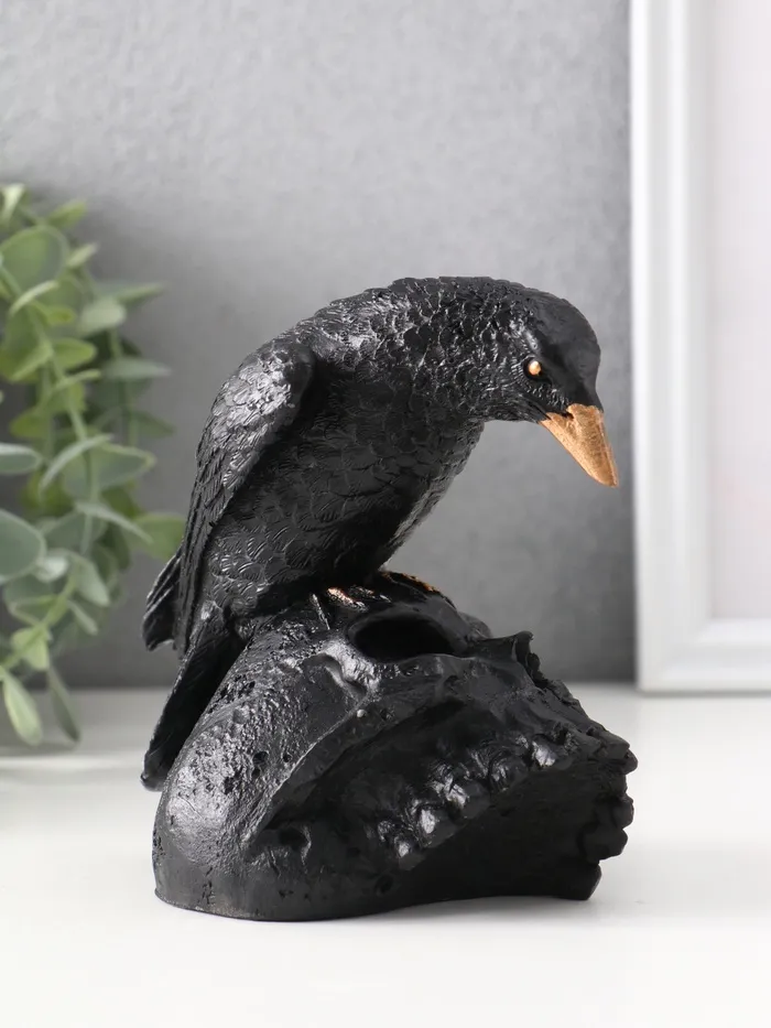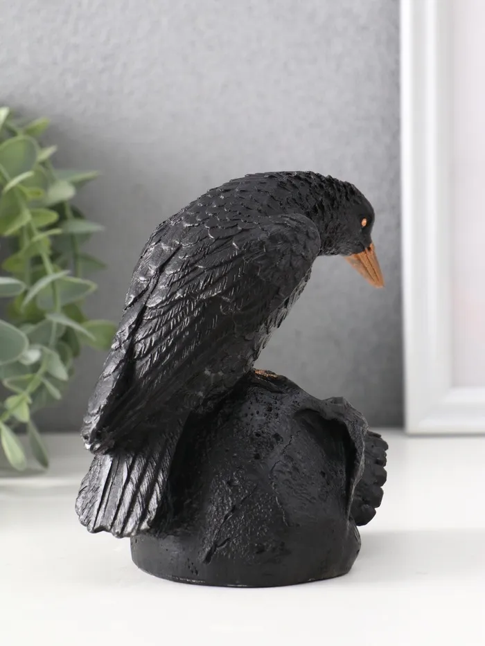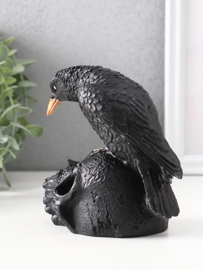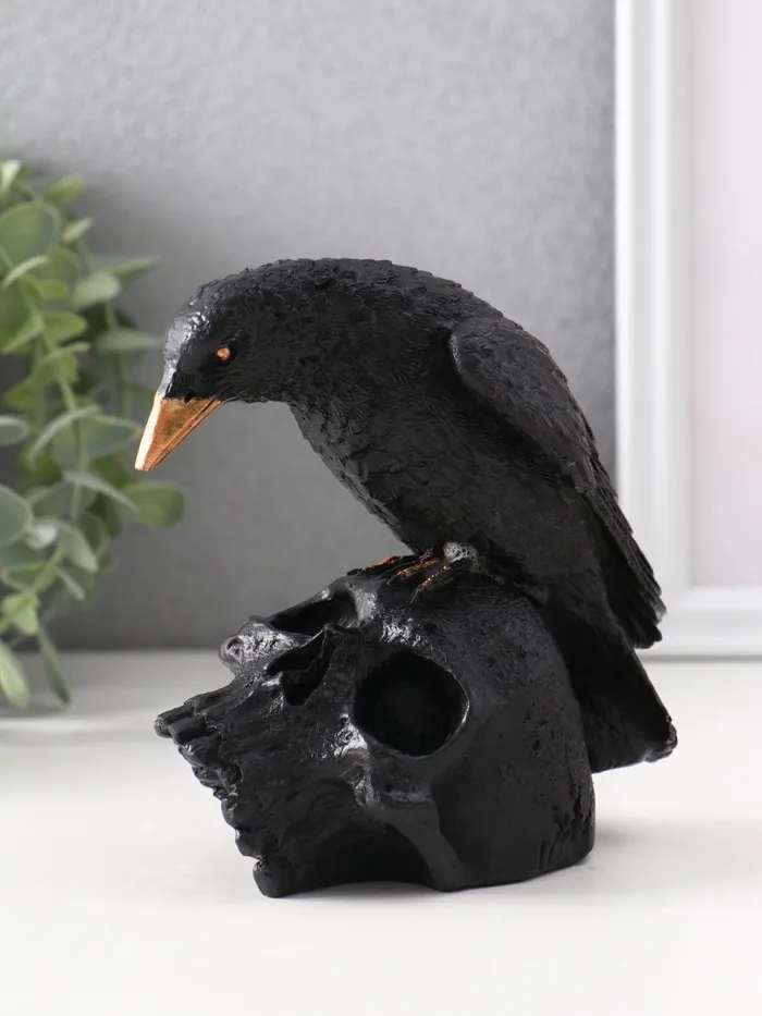 Эта готическая статуэтка создаёт атмосферу таинственности и интеллектуальной глубины. Чёрный ворон, восседающий на черепе, станет выразительным акцентом в интерьере, подчеркнёт индивидуальность владельца и его вкус к символике. Изделие подходит для оформления пространства в течение всего года, приобретая особое значение в сезон Хэллоуина.