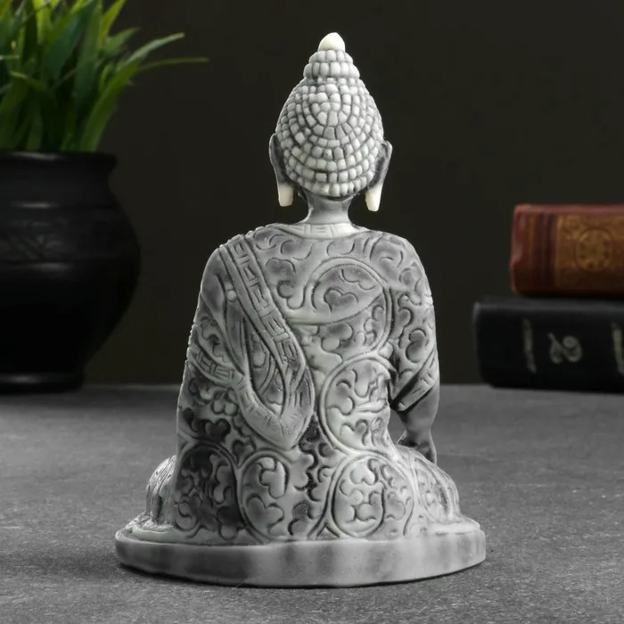 Компактный размер 10,5 см делает фигурку идеальным акцентом для рабочего стола, книжной полки или домашнего алтаря. Её лаконичные серые тона и естественная фактура материала создают ощущение умиротворения, а тщательно проработанные детали образа Будды подчеркивают мастерство исполнения.