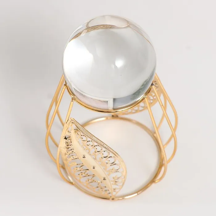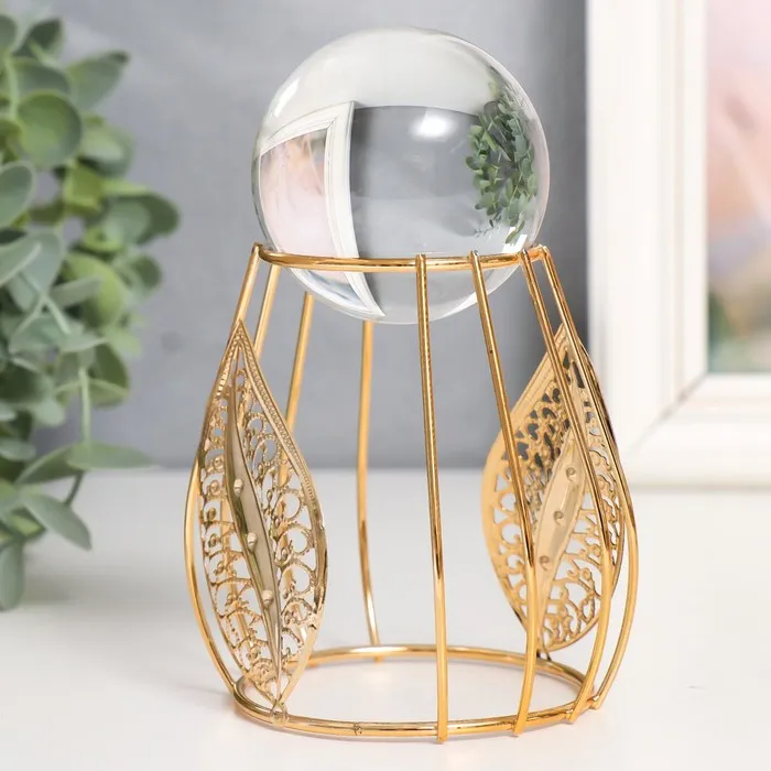 Композиция выполнена из металла с золотистым покрытием и дополнена элементами из стекла, создающими эффект дорогого акцента без излишней вычурности. Центральный шар, окружённый ажурными листьями, придаёт изделию воздушность и символизм — будто застывшая капля света, которая становится фокусной точкой в любом интерьере. Размеры (9.5×9×14 см) позволяют разместить её как на полке, так и на журнальном столике или каминной доске.