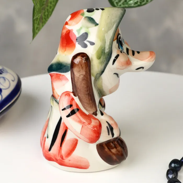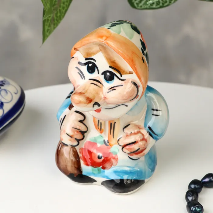 Фигура «Буся» изображает Бабу-ягу, одну из самых известных героинь русского фольклора. Выполненная в традиционной гжельской технике, она украшена красочными узорами и переливается всеми цветами радуги. Эта фигурка идеально подойдет для интерьера в стиле русского народного или для празднования новоселья.