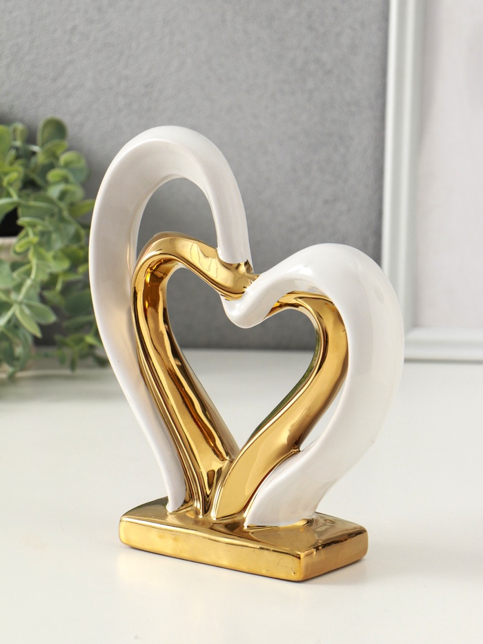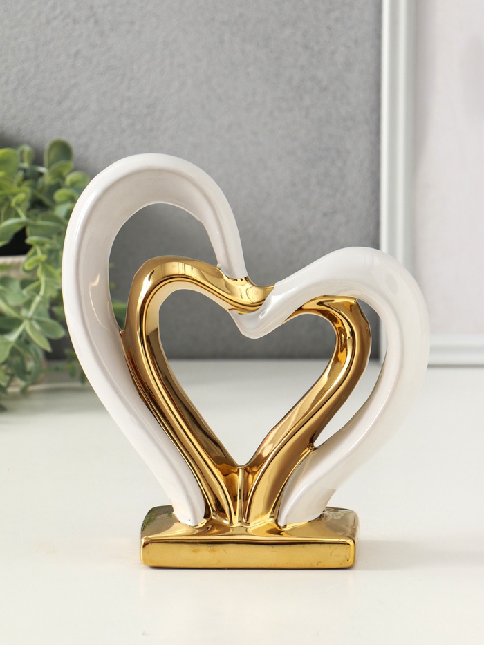 Эта керамическая фигурка — настоящее воплощение нежности и гармонии, созданное для тех, кто ценит изысканность и символику. Два сплетённых сердца, выполненные в белом и золотом цвете, становятся не просто украшением интерьера, а символом любви, единства и теплых отношений. Размеры 5.5×17.5×19.5 см делают её универсальной: она органично впишется как на полку в гостиной, так и на рабочий стол, наполняя пространство уютом и элегантностью.