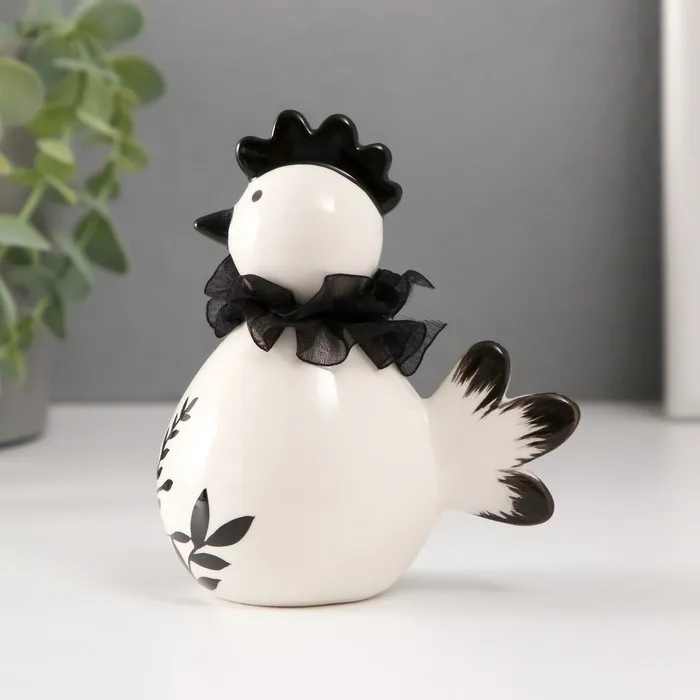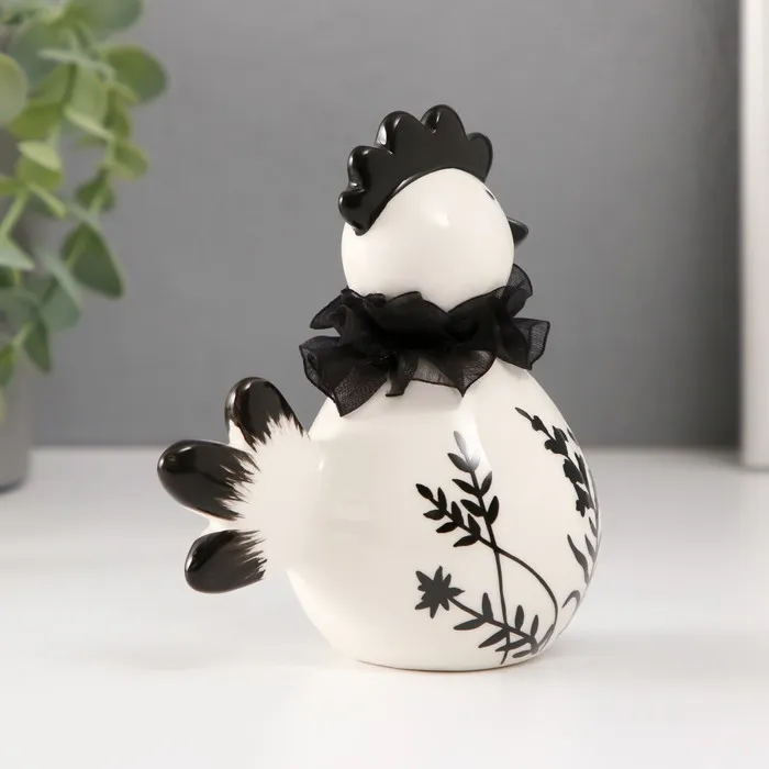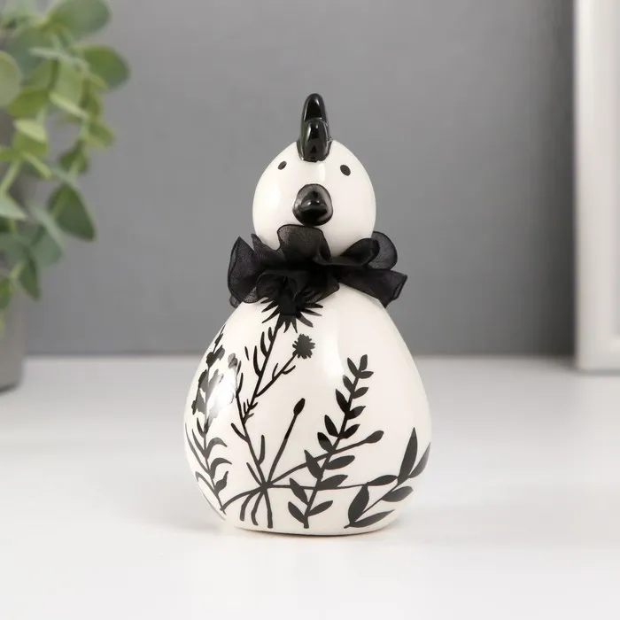 Эта керамическая фигурка цыплёнка высотой 11,6 см сочетает в себе деревенское очарование и современный минимализм. Контрастное бело-чёрное исполнение с изображением разнотравья создаёт необычный графический эффект, напоминающий гравюру.