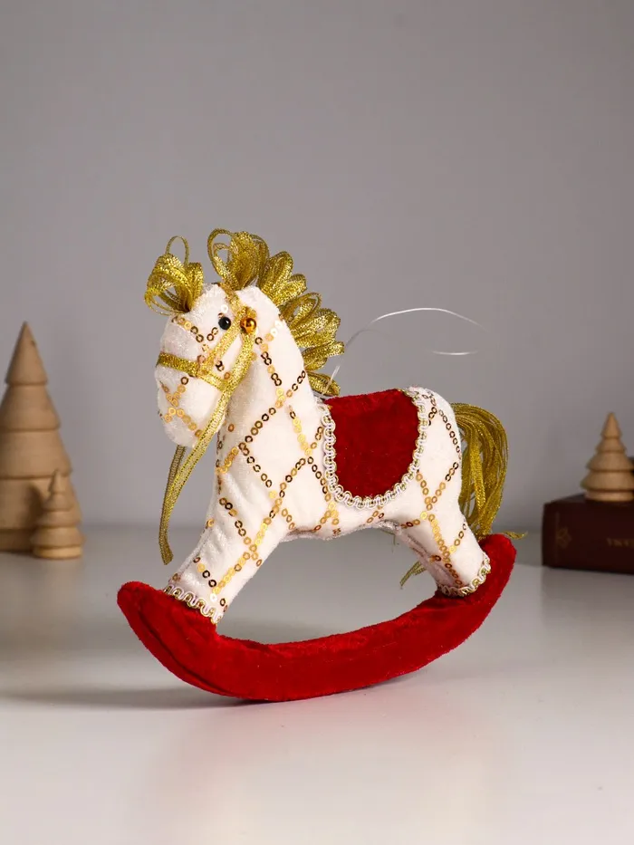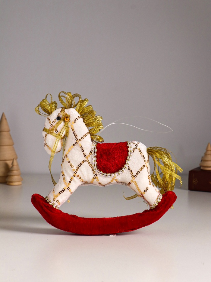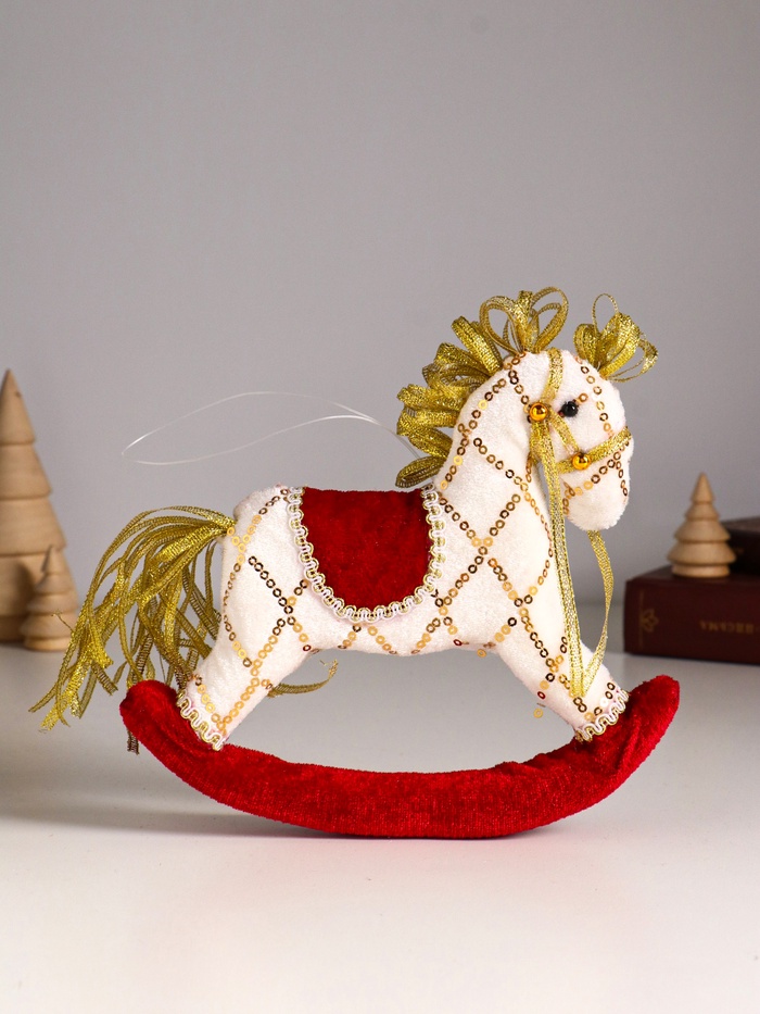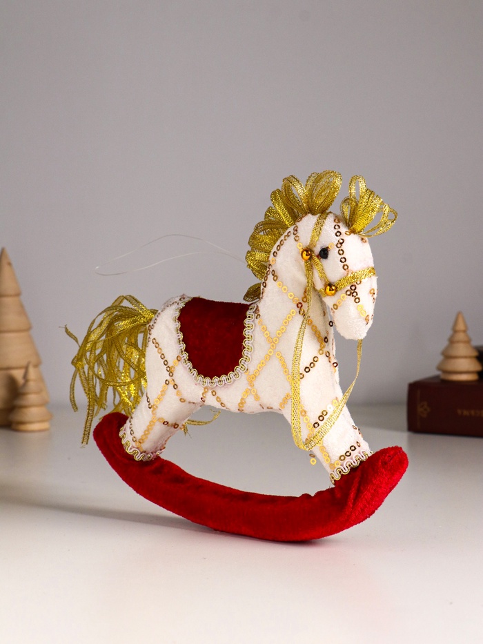 Эта изящная лошадка-качалка, выполненная из лёгкого пенопласта и текстиля, станет ярким акцентом в праздничном декоре и символом наступающего 2026 года. Высота 18 см и разноцветные пайетки придают фигурке живость и праздничное настроение, позволяя ей органично вписаться как в интерьер новогодних праздников, так и в композиции, посвящённые рождению ребёнка.