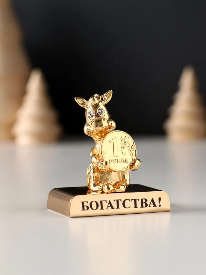 - Талисман богатства: монетка на подставке и тематическое пожелание усиливают энергетику финансового благополучия.