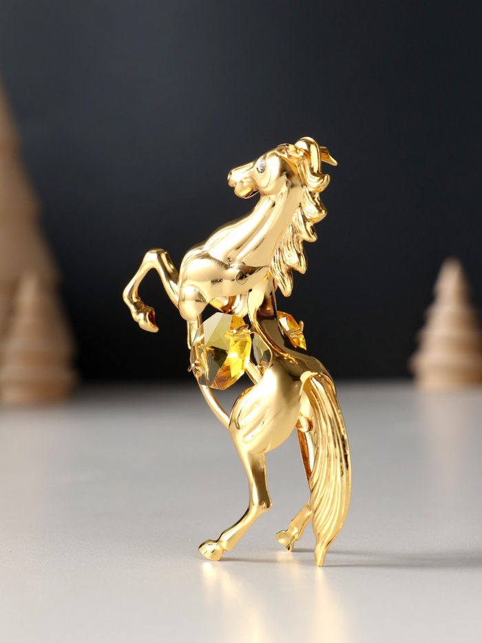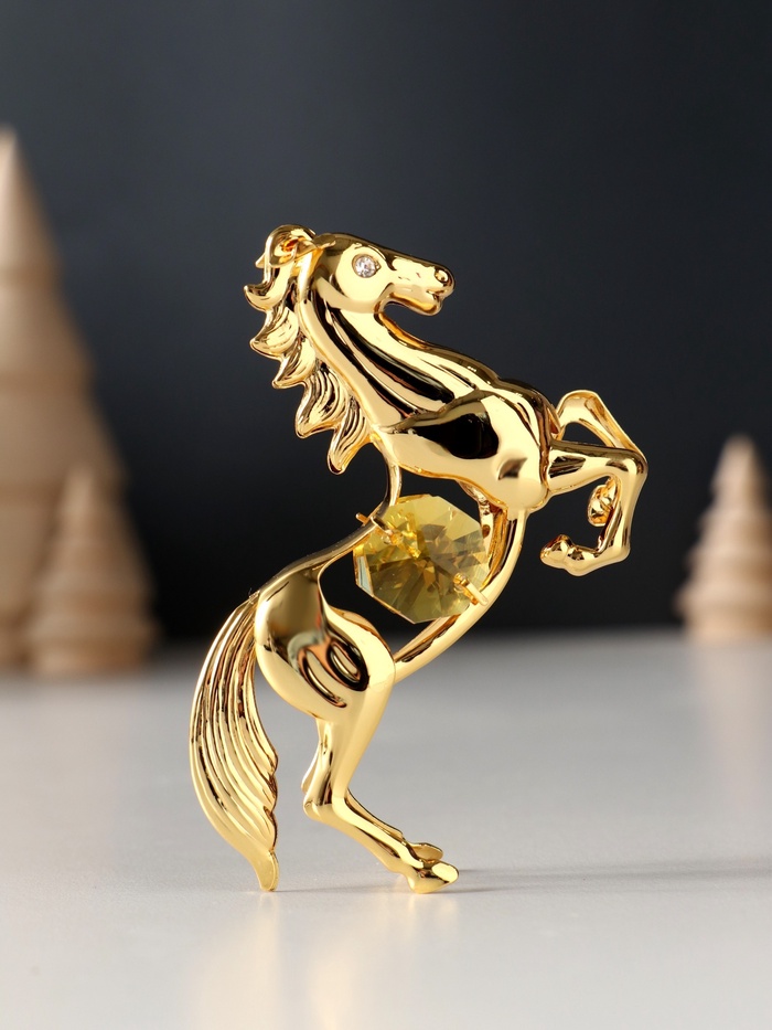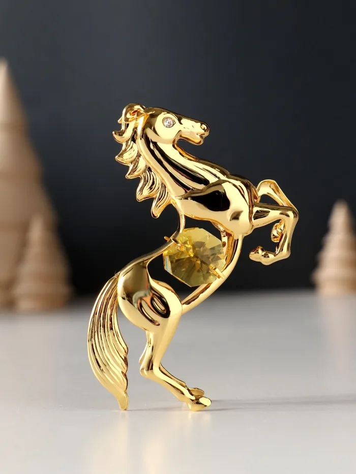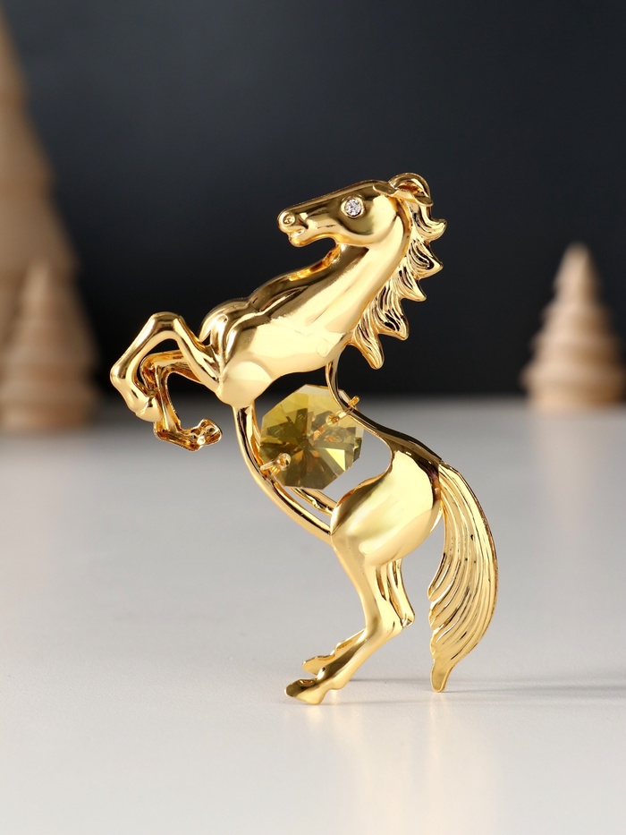Золотистая металлическая фигурка в образе лошади с двумя жёлтыми хрусталиками представляет собой гармоничное сочетание изящества и символизма. Яркие кристаллы подчёркивают динамичность и грациозность силуэта, а тёплый золотистый оттенок металла придаёт изделию благородство и роскошь. Компактные размеры 5.5×2×8 см делают фигурку удобной для размещения в любом уголке интерьера, добавляя ему особенный шарм и праздничное настроение.