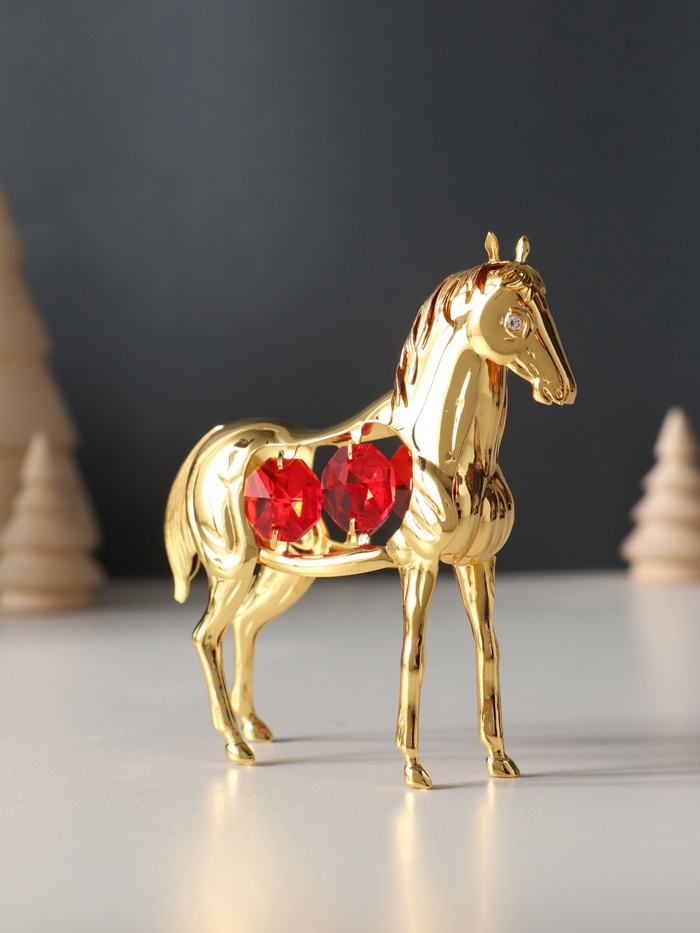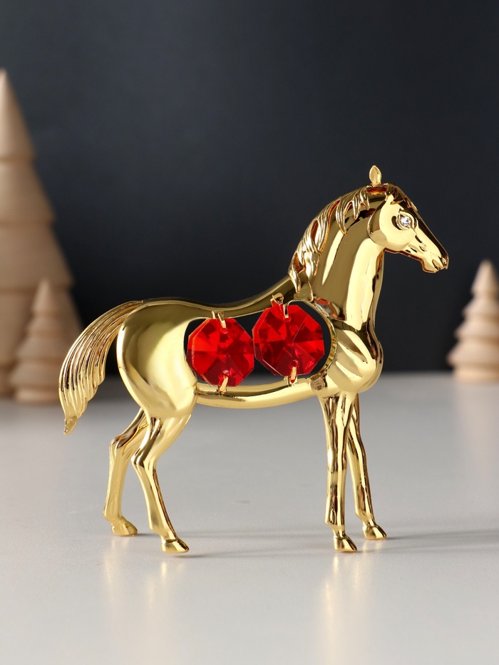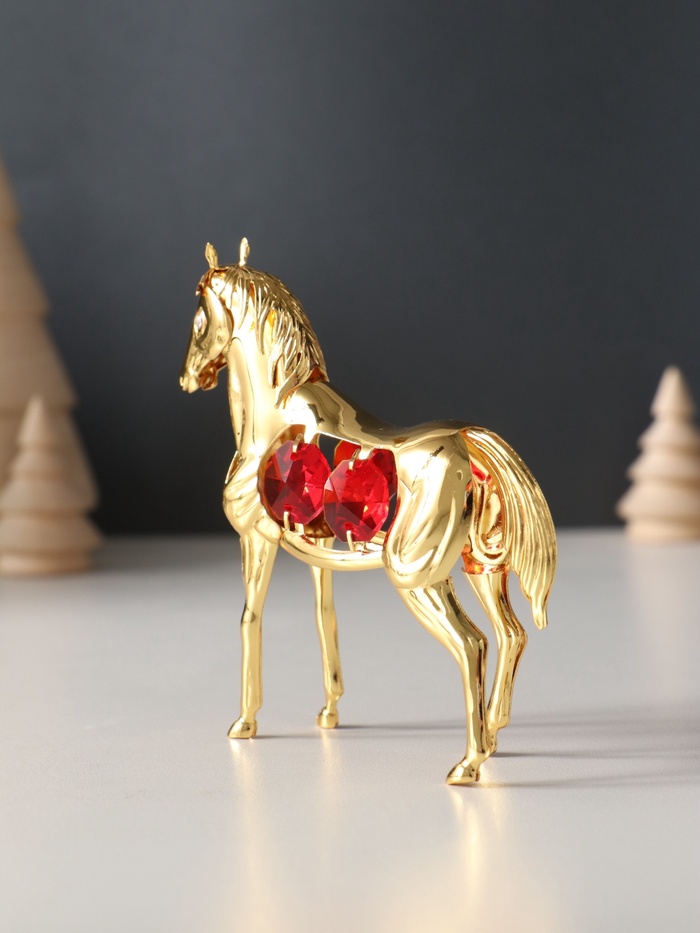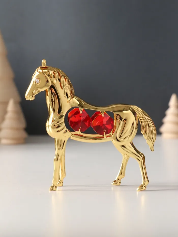 Металлическая фигурка в виде лошади с четырьмя красными кристаллами — изящное украшение, которое привлечёт внимание своей утончённой детализацией и благородным золотистым оттенком. Компактные размеры 9×3×9 см делают её универсальным элементом декора, способным гармонично вписаться в интерьер любого стиля.
