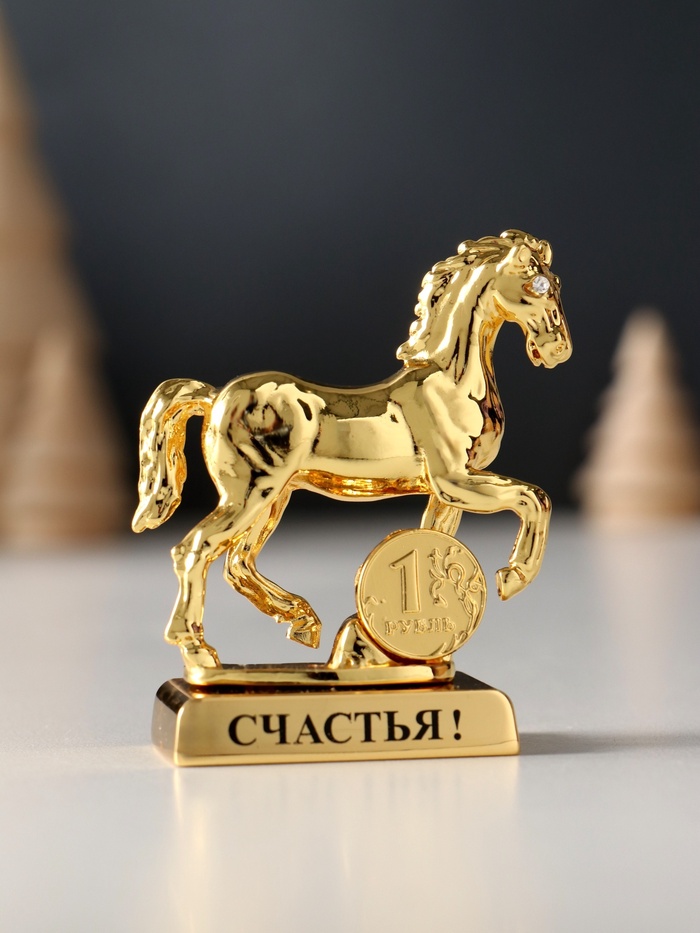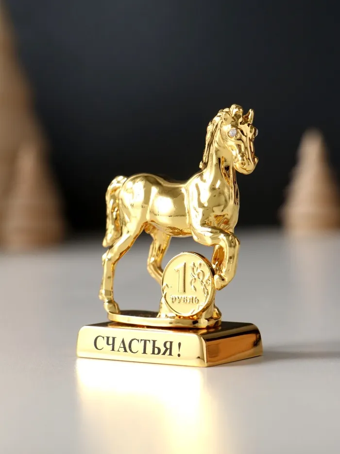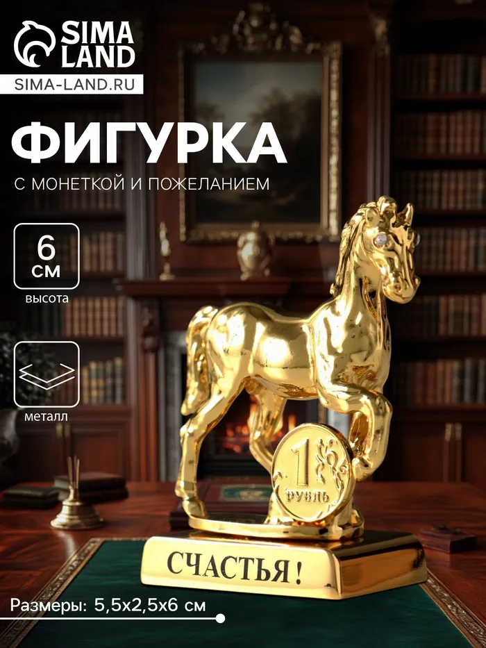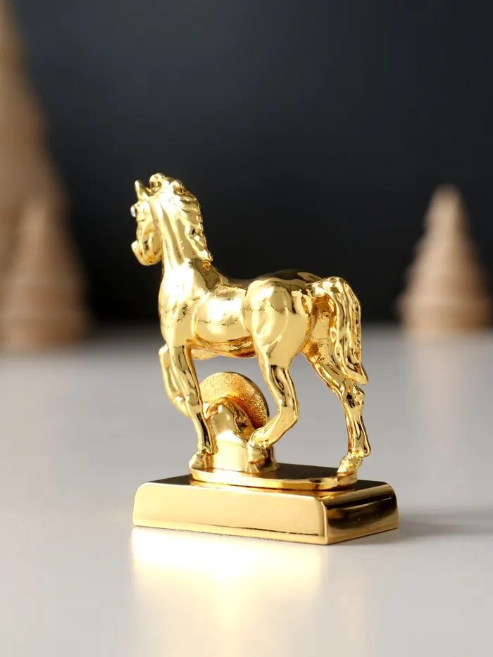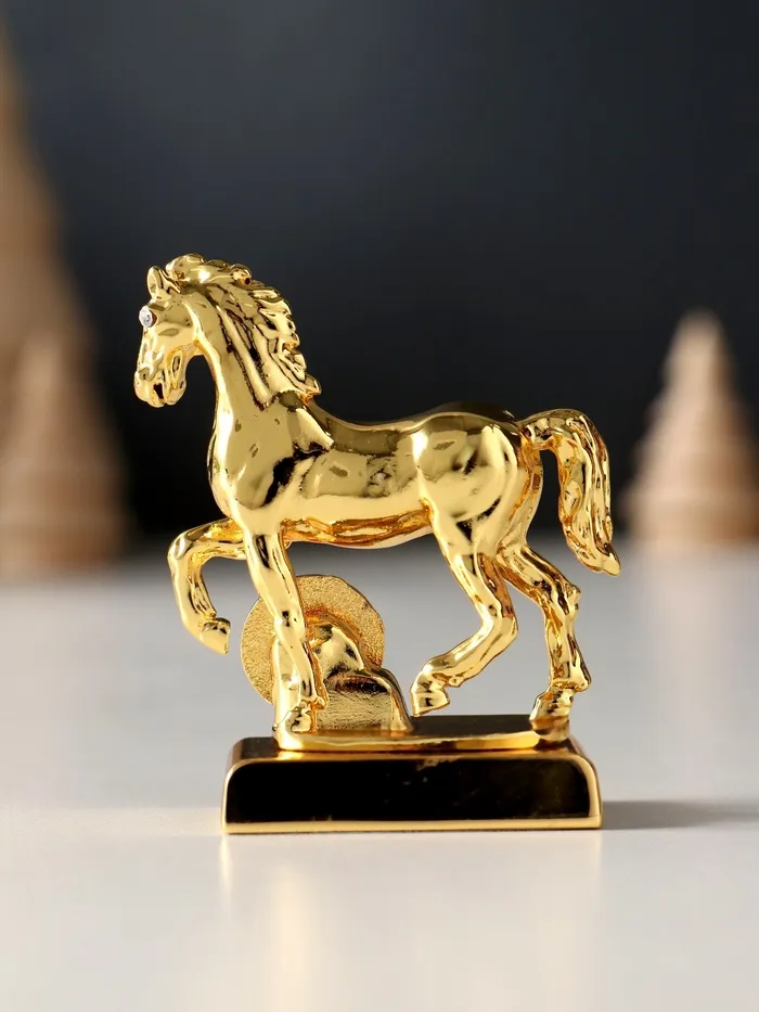 Золотистая металлическая фигурка в форме лошади с монеткой и пожеланием «Счастья» — это изящный символ удачи и гармонии, созданный специально для 2026 года, года Лошади. Компактные размеры 5.5×2.5×6 см позволяют легко вписать её в любой интерьер, добавив ему тёплую атмосферу и позитивный настрой.