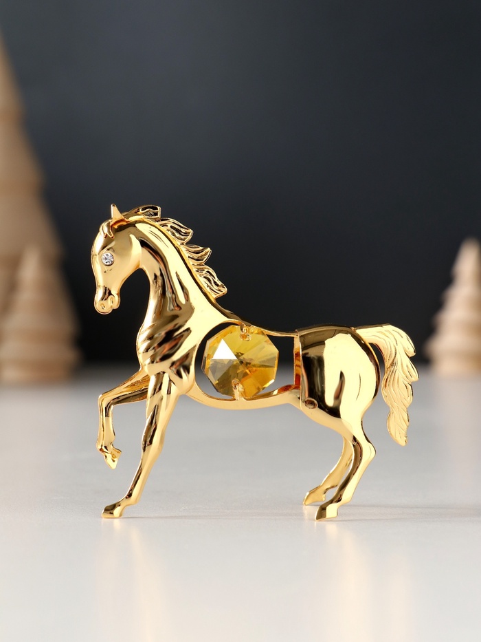 Компактные размеры (7×2×6 см) позволяют разместить её где угодно: на офисном столе среди документов, на трюмо рядом с украшениями или на праздничном столе. Особенно актуальной она станет в 2026 году — год Лошади по восточному календарю, но тёплое сочетание золота и жёлтых кристаллов делает её уместной в любое время года.