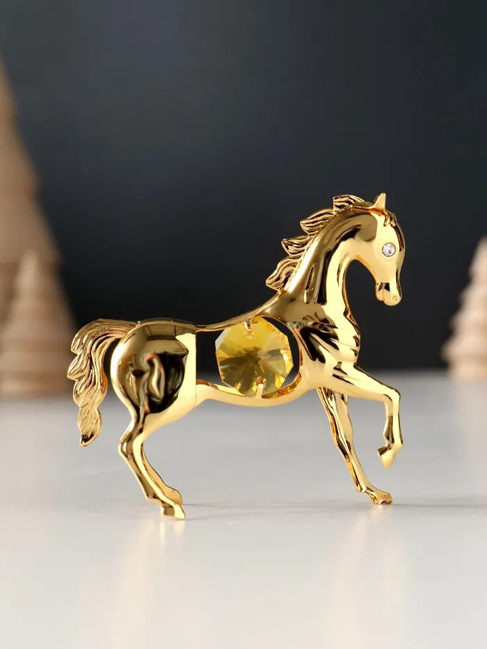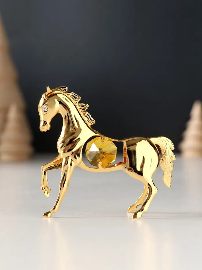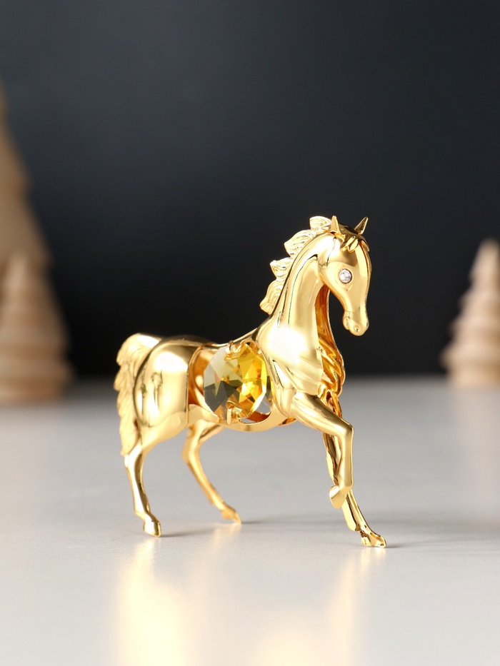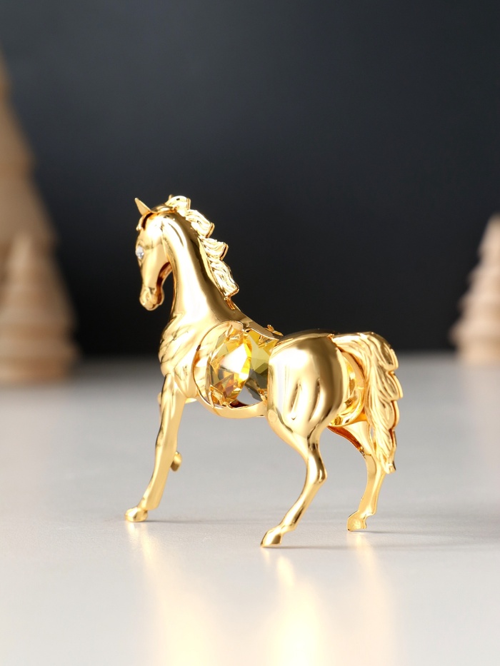Золотистая лошадка с солнечными хрусталями словно несёт в себе энергию летнего дня. Эта изящная фигурка высотой 6 см — воплощение динамики и грации, застывшее в металле.