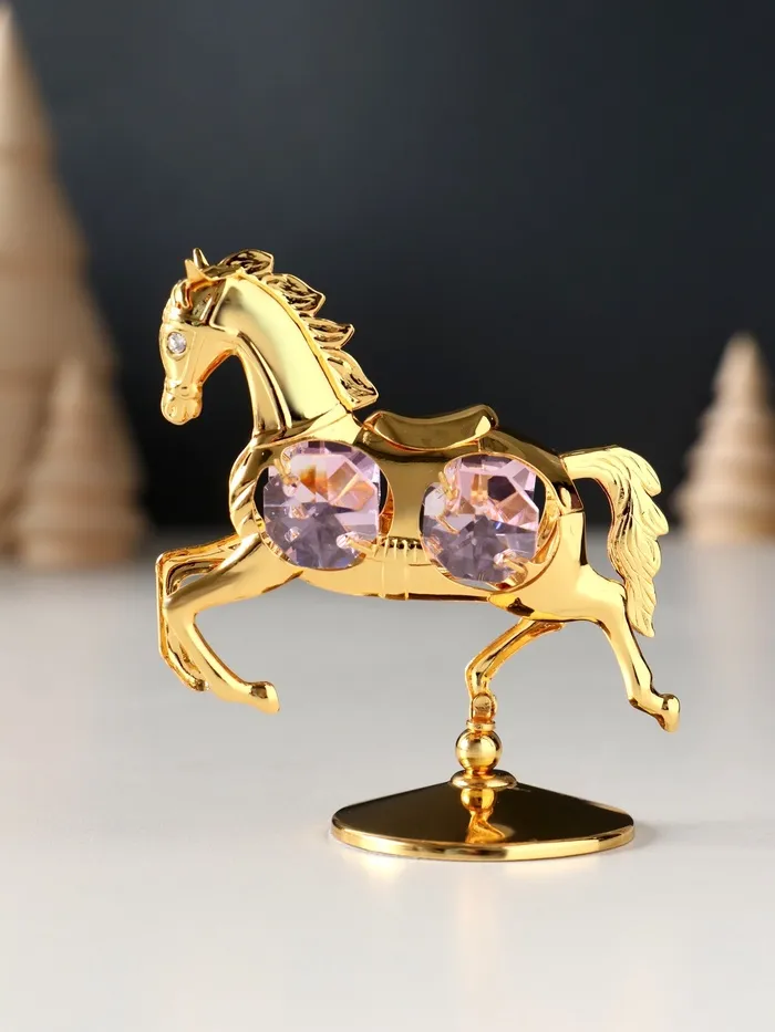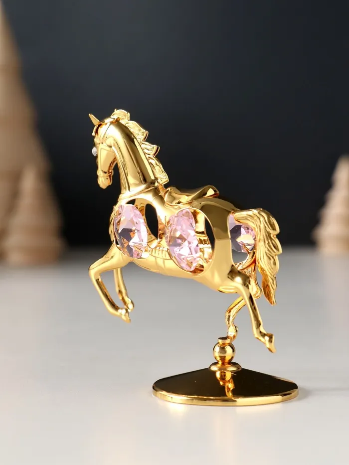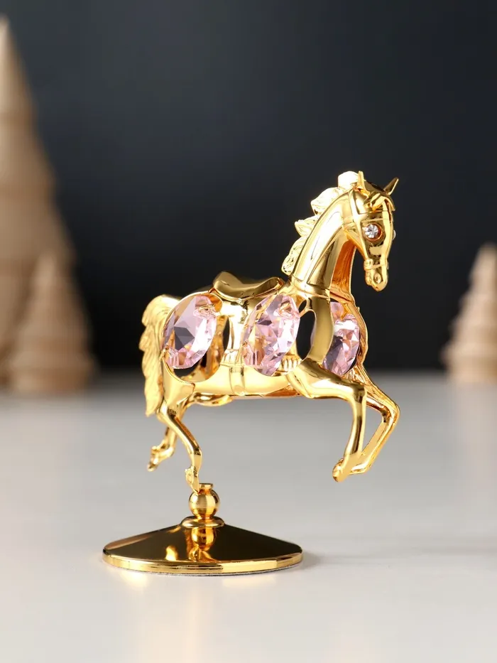Представляем изящный элемент декора, который станет символом удачи и благополучия в вашем доме. Маленькая фигурка лошади с четырьмя розовыми хрусталиками на подставке — это не просто украшение, а настоящее произведение искусства, выполненное из металла с золотистым покрытием. Её размеры (6,5×4×8,5 см) делают её идеальным акцентом для любого интерьера: от праздничного стола до каминной полки или рабочего стола.