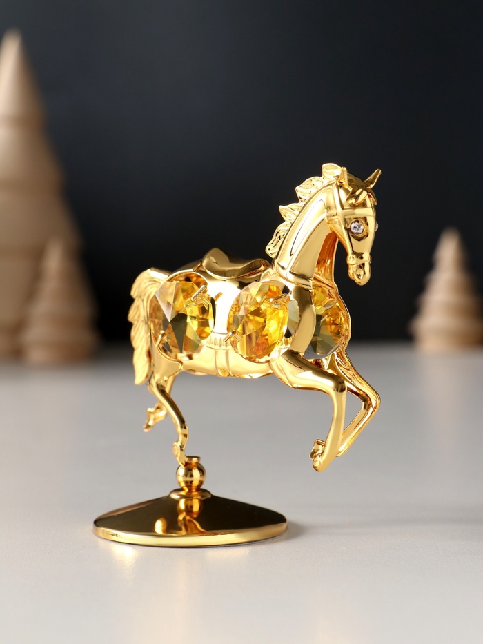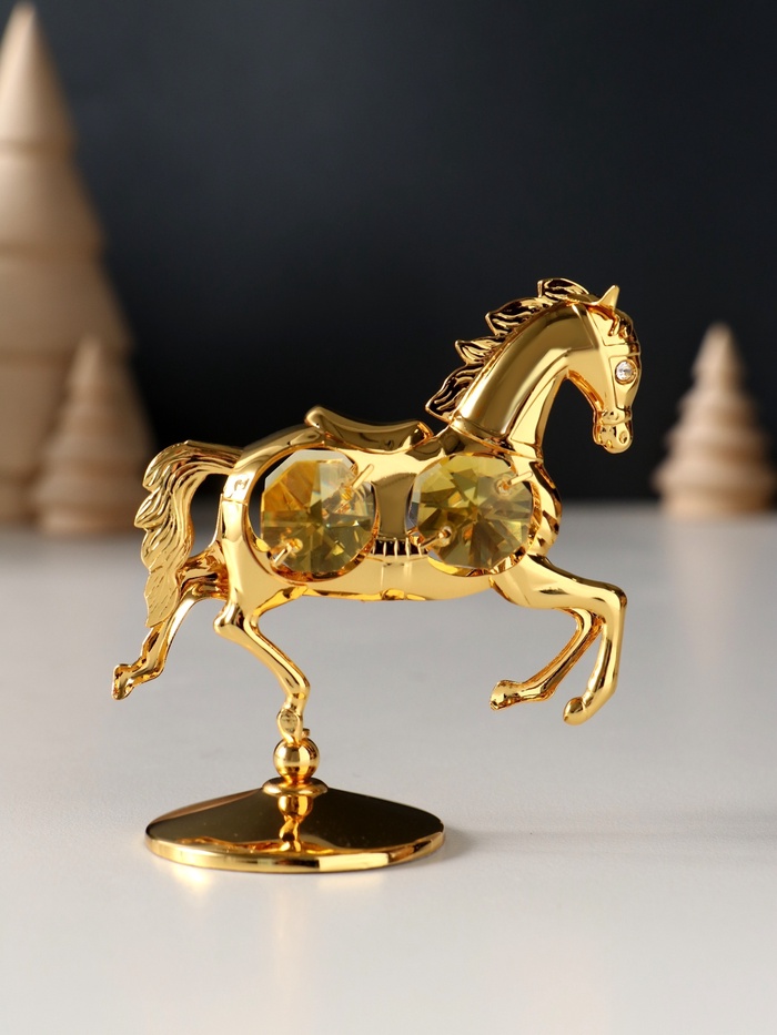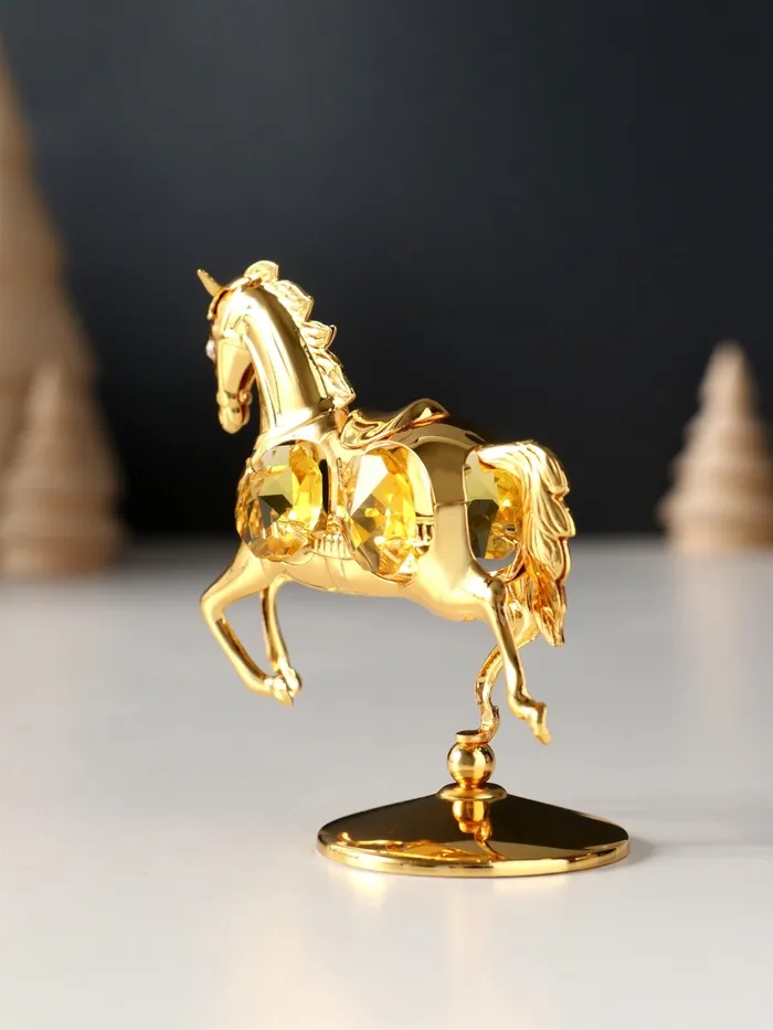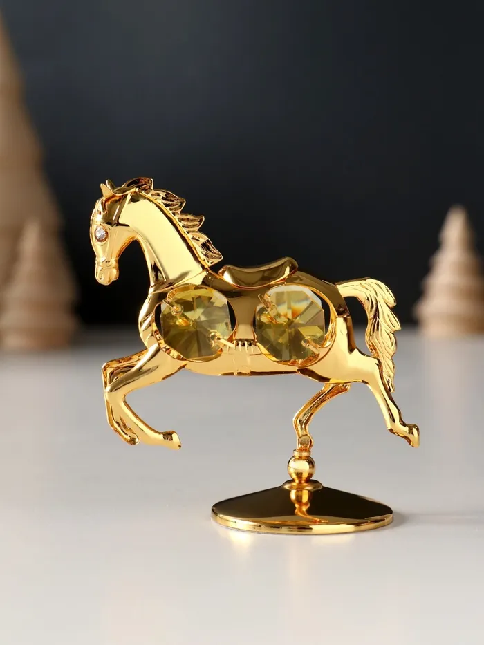 Превратите ваш интерьер в пространство изысканности и символичности с очаровательной металлической фигуркой лошадки, украшенной четырьмя жёлтыми хрусталиками. Эта маленькая статуэтка на подставке станет не просто декоративным элементом, а настоящим символом силы, энергии и благополучия, особенно актуальным в год Лошади — 2026.