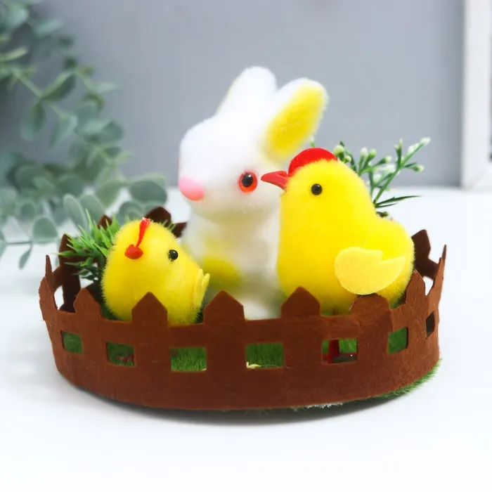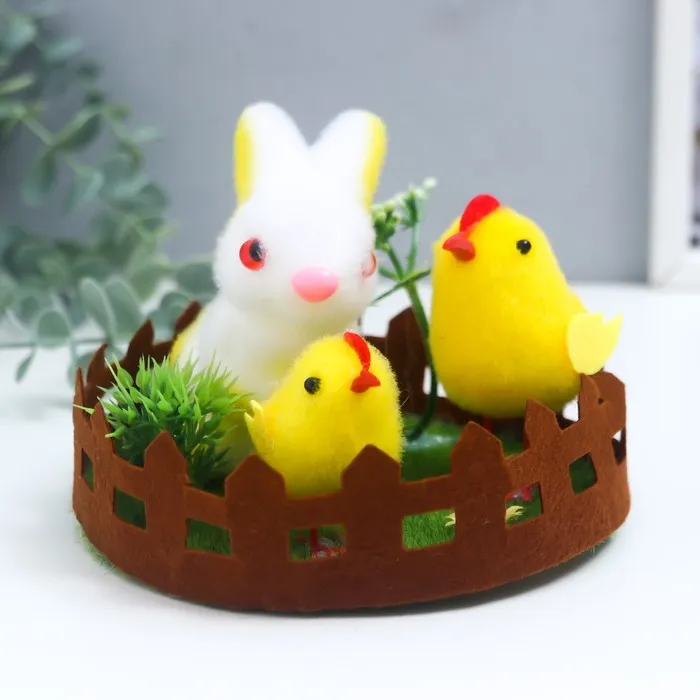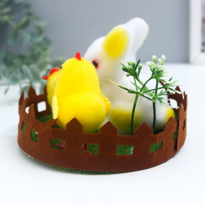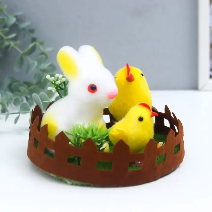 Фигурка пасхальная «Кролик и два цыплёнка на лужайке с цветами», 14×14×10.5 см — Характеристики