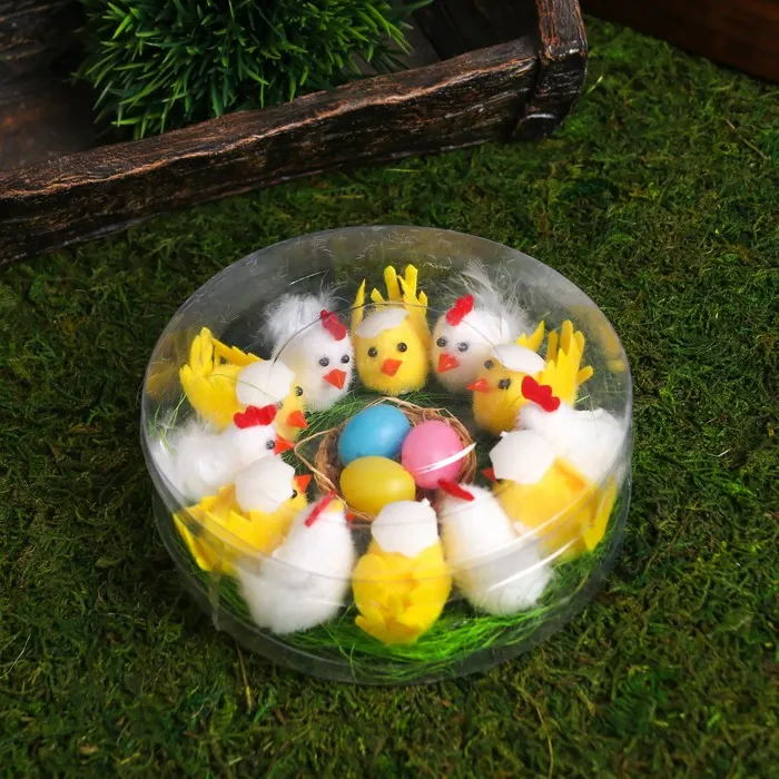 Создайте атмосферу весеннего праздника с этой очаровательной композицией. Двенадцать разноцветных цыплят расположились в уютном гнезде из натуральной сизали, окружённые декоративными яичками — такая картина сразу поднимает настроение и наполняет дом теплом. Каждый элемент набора (14 см в диаметре) выполнен с вниманием к деталям, создавая законченную пасхальную историю.