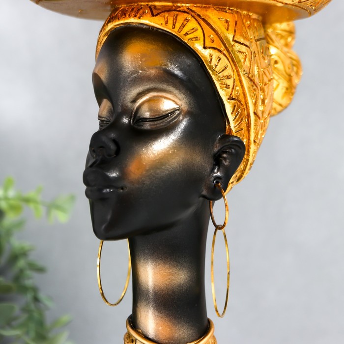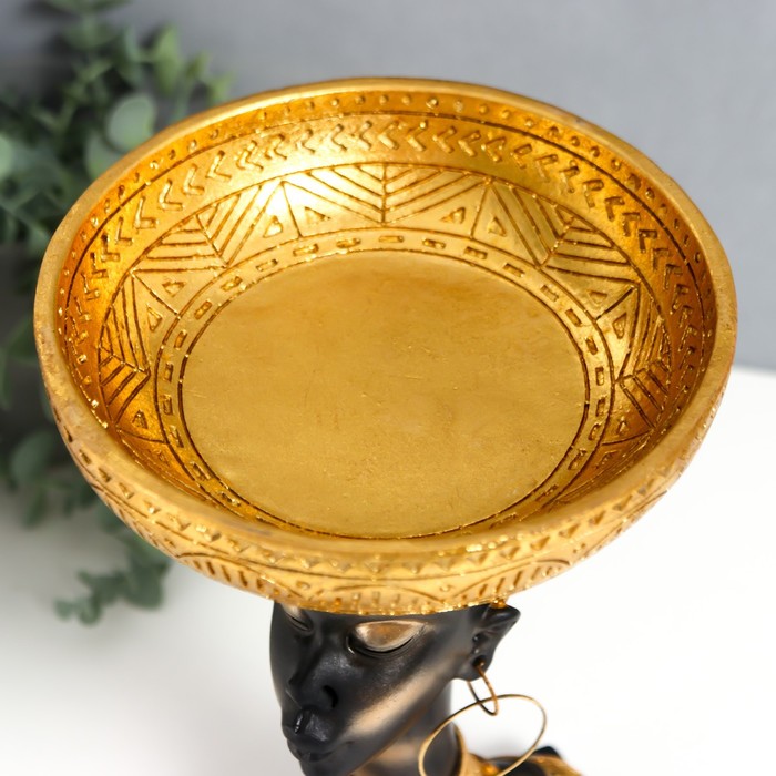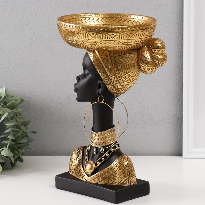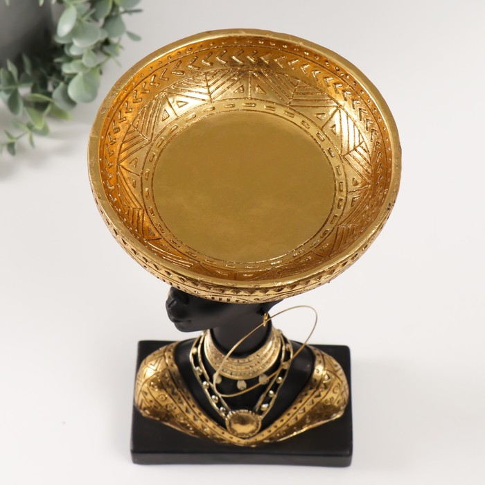 Эта изящная фигурка-подставка — больше, чем просто украшение. Она создаёт настроение и порядок, превращая мелкие вещицы в часть интерьерной композиции. Статуэтка в виде женщины с изящной осанкой и золотой тарелкой на голове привносит в пространство ноту африканской эстетики, спокойствия и гармонии.