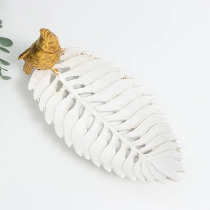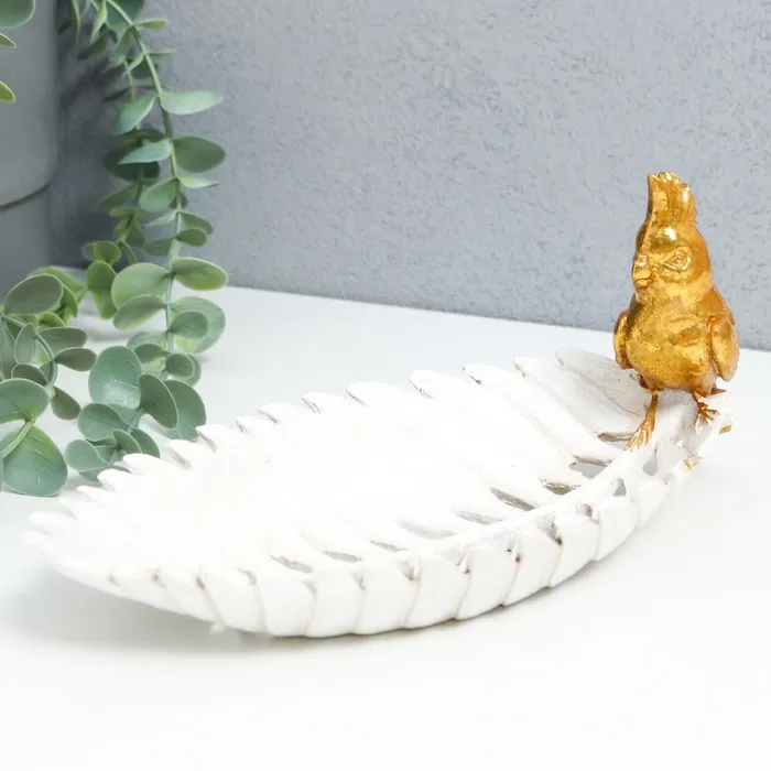 Фигурка-подставка для мелочей полистоун «Золотой попугайчик с хохолком на белом листе», 11×24.5×11 см — Характеристики