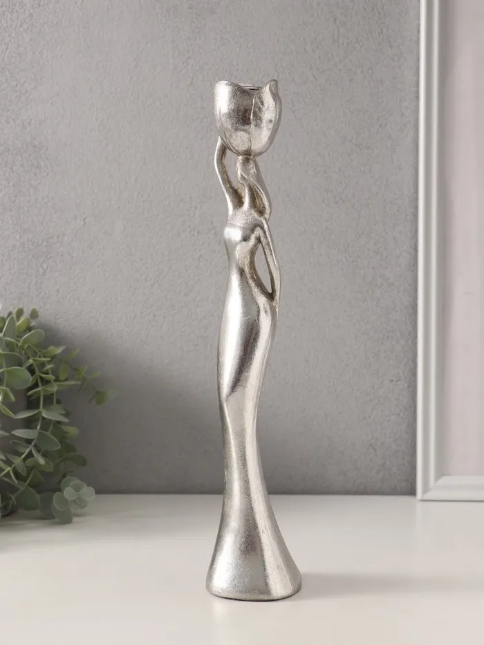 Позвольте себе насладиться изысканностью и утончённостью, которые привнесёт в ваш интерьер этот уникальный подсвечник. Фигурка девушки с тюльпаном, выполненная в серебристом оттенке, словно олицетворяет грацию и нежность, создавая атмосферу романтики и уюта. Этот аксессуар станет не только функциональным элементом, но и настоящим произведением искусства в вашем доме.