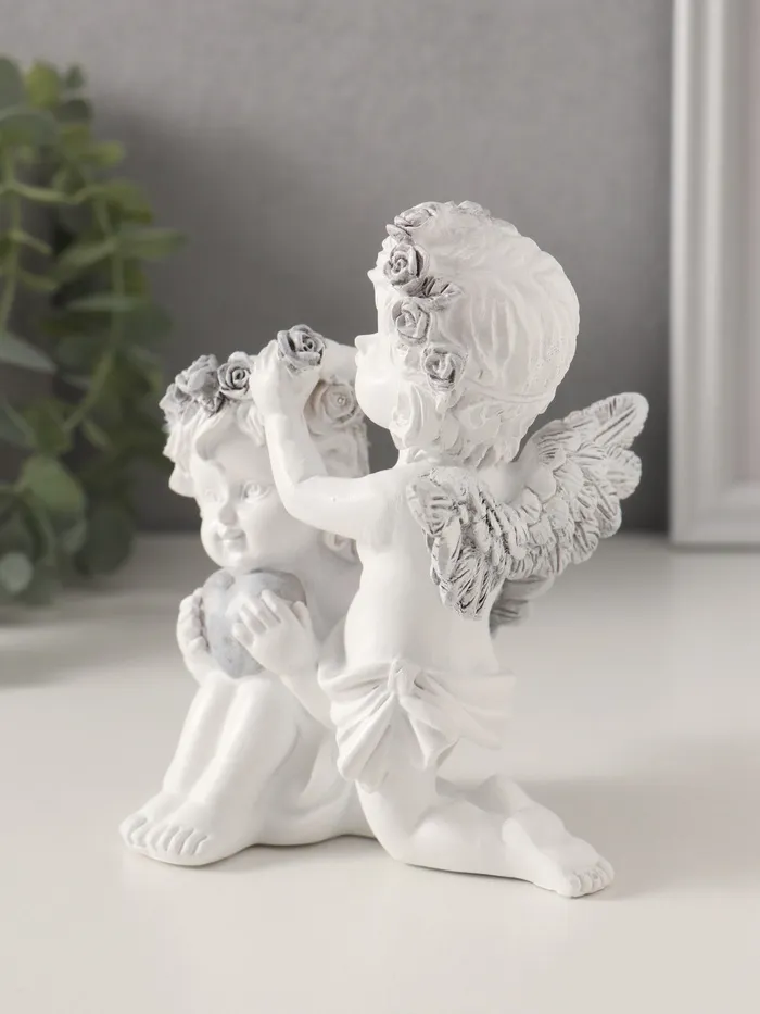 Фигурка изображает ангелочков, вплетающих венок в волосы, что создаёт трогательную и умиротворяющую композицию. Сочетание белого и серого оттенков придаёт изделию сдержанность и элегантность, делая его универсальным элементом декора для любого праздника или повседневного интерьера. Её компактные размеры позволяют легко разместить её на полке, столе или в витрине, добавляя пространству тепла и гармонии.