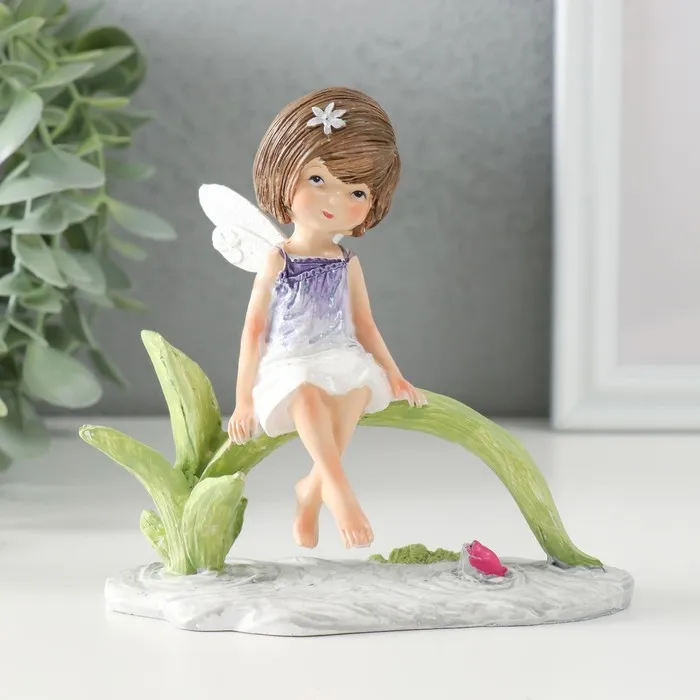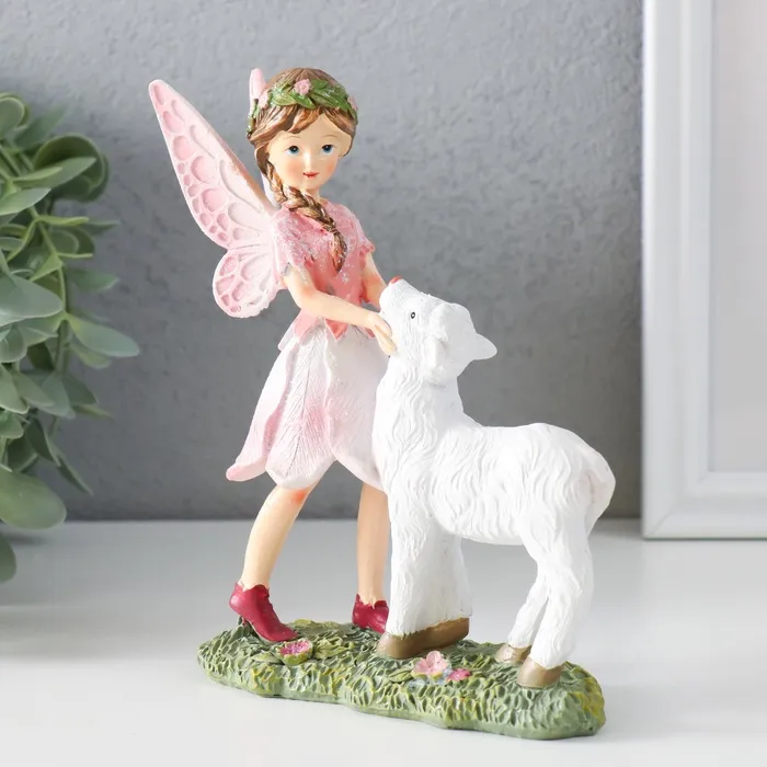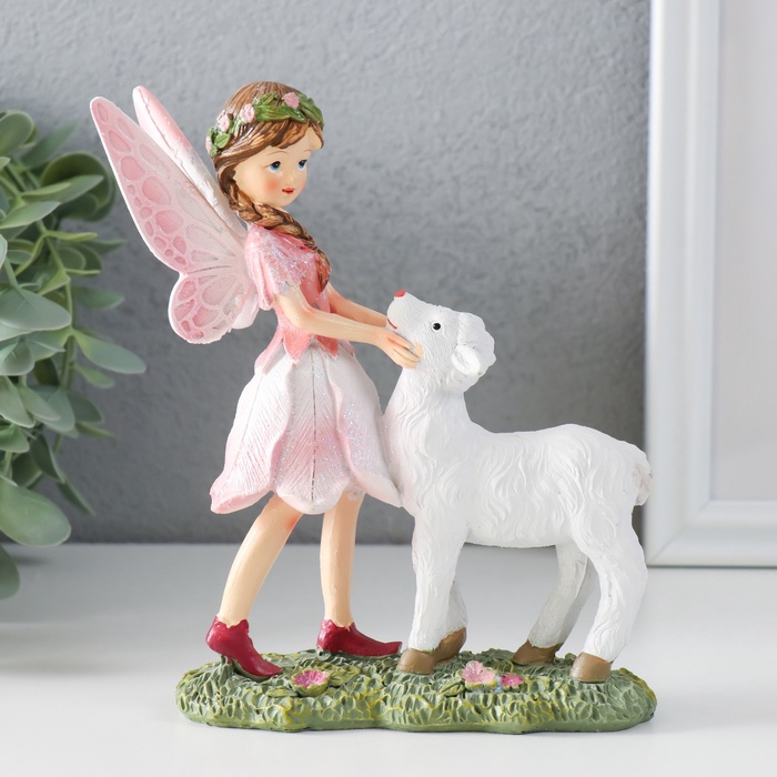 Фигурка полистоун «Девочка-бабочка с барашком на полянке», розовые крылья, 13.5×5.5×15.5 см — Характеристики