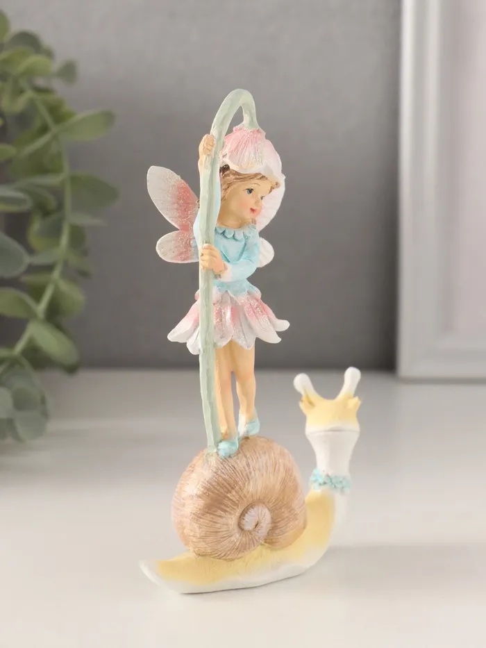 Представляем очаровательную фигурку, которая перенесёт вас в мир волшебства и беззаботности. Маленькая фея, удобно устроившаяся на спине улитки, держит в руках колокольчик, словно готовясь поделиться мелодией счастья с каждым, кто её заметит. Высотой всего 13,5 см, она станет изысканным акцентом вашего интерьера, добавляя нотку игривости и тепла.