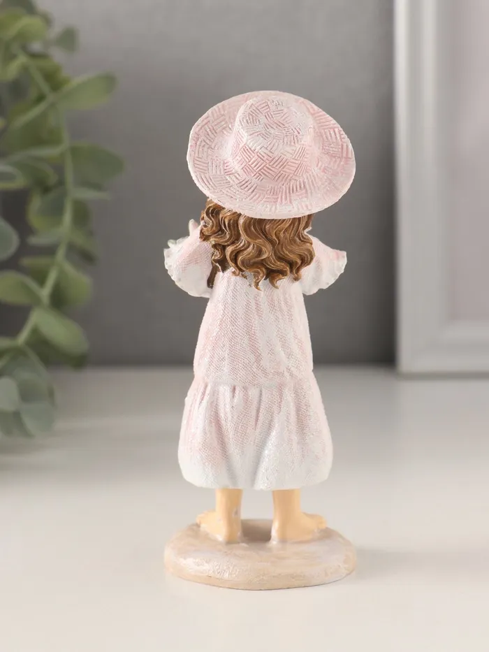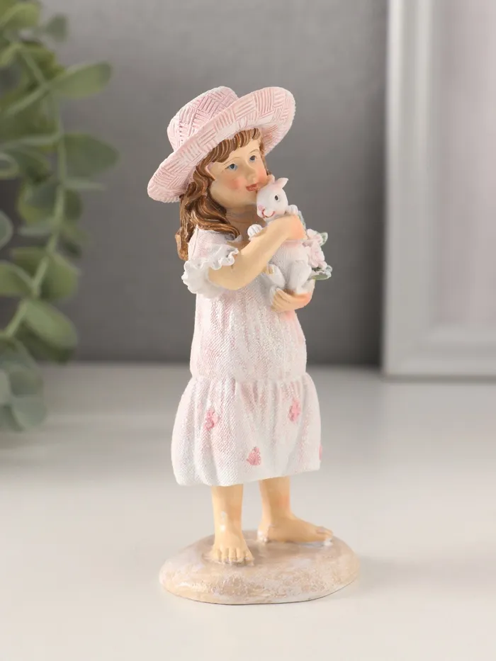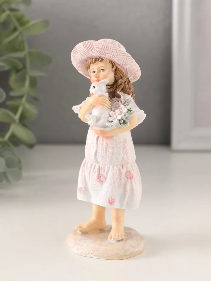 Фигурка изображает девочку в шляпке, держащую на руках кролика и букет цветов, что подчёркивает её невинность и любовь к природе. Розовый и белый оттенки, дополненные детальной проработкой, создают гармоничный образ, который идеально впишется в любой стиль интерьера — от классического до современного. Её компактные размеры (5×4,5×12 см) позволяют легко разместить её на полке, столе или в витрине, где она будет радовать глаз и вдохновлять.