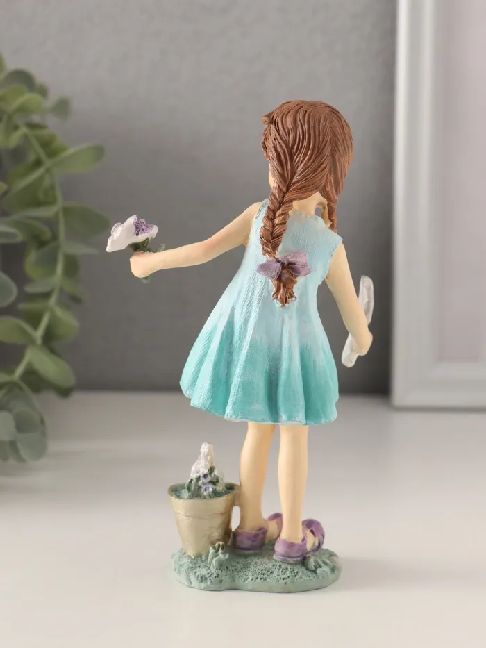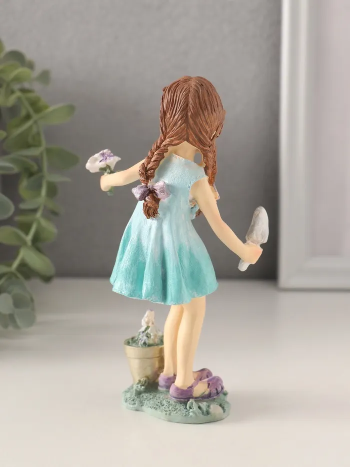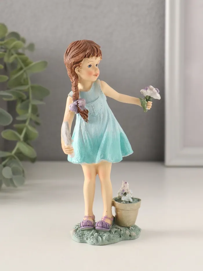 Представляем очаровательную фигурку, которая словно оживает в лучах света, наполняя пространство теплом и уютной атмосферой. Маленькая девочка в бирюзовом платье, заботливо сажающая цветы, будто переносит нас в мир гармонии с природой. Высотой всего 14,5 см, она станет изысканным акцентом вашего интерьера, добавляя нотку свежести и беззаботности.