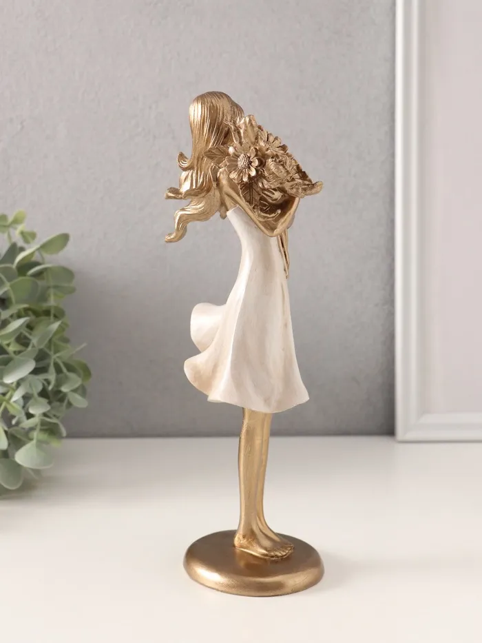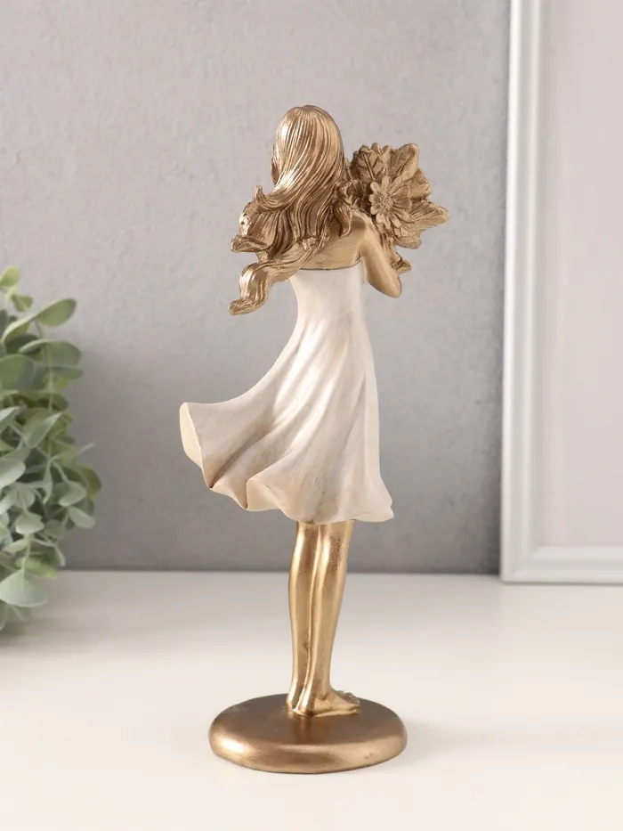 Фигурка высотой 23,5 см изображает девушку с охапкой подсолнухов — символом солнечного света и позитивной энергии. Разноцветное покрытие с золотистыми акцентами добавляет изделию особую выразительность, делая его центральным элементом любого пространства. Этот декоративный элемент не просто украшает, но и вдохновляет на добрые мысли и уютные моменты.