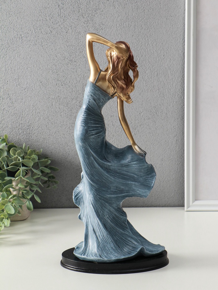 Погрузитесь в мир изящества и утонченности с фигуркой, которая станет настоящим украшением вашего интерьера — девушкой в синем вечернем платье со стразами. Эта элегантная композиция высотой 37 см выполнена из качественного полистоуна и станет идеальным акцентом в любом помещении.