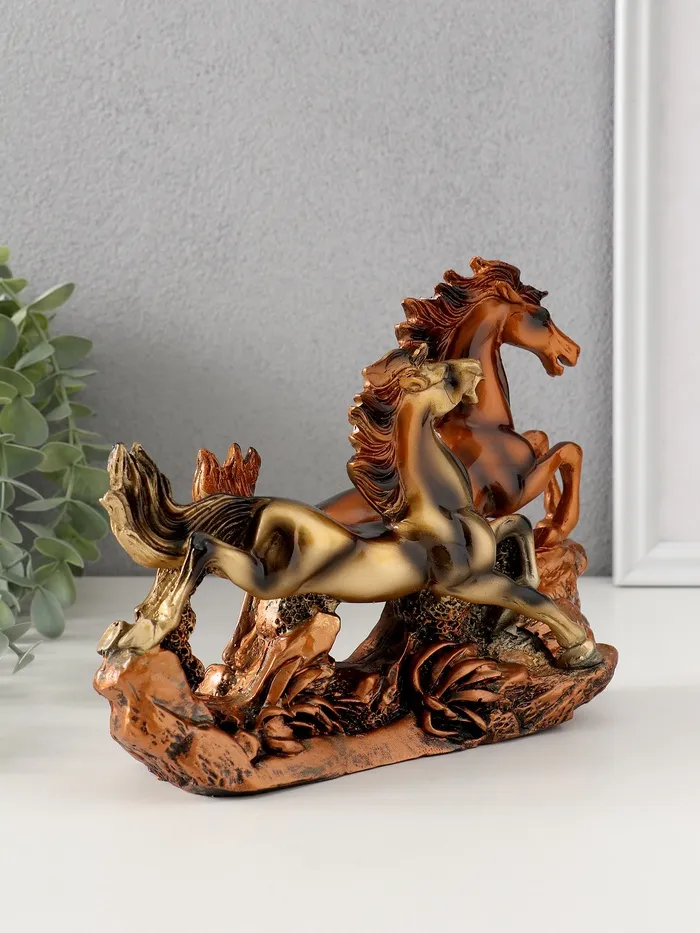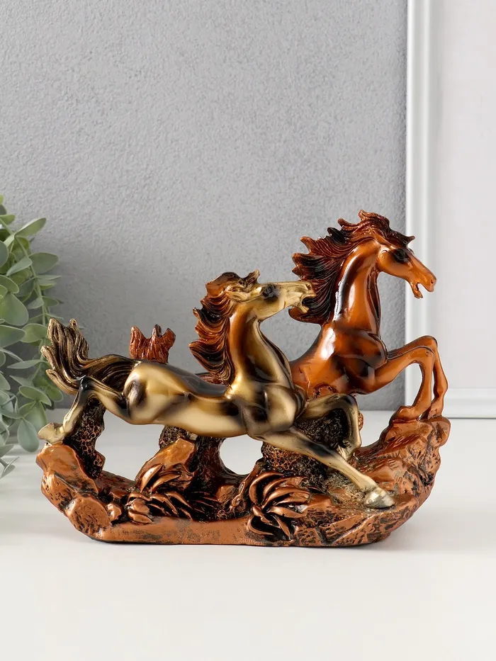 Позвольте себе на мгновение ощутить дух свободы и бескрайних просторов с этой изысканной скульптурной композицией. Динамика и грация диких лошадей, застывшие в полистоуне под благородной бронзовой патиной, привнесут в ваш интерьер ноту природной гармонии и движения.