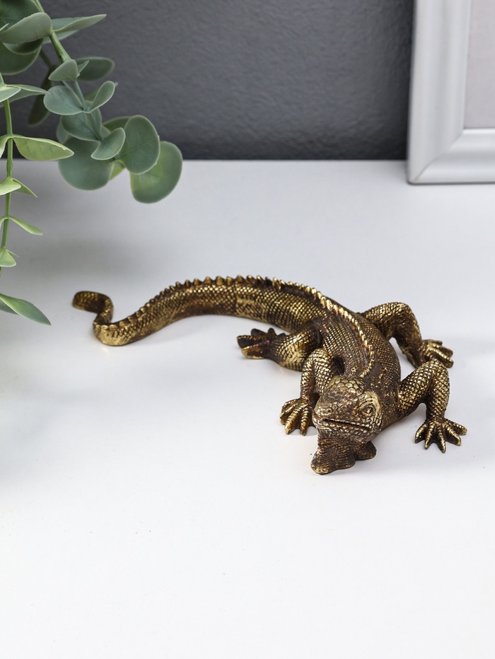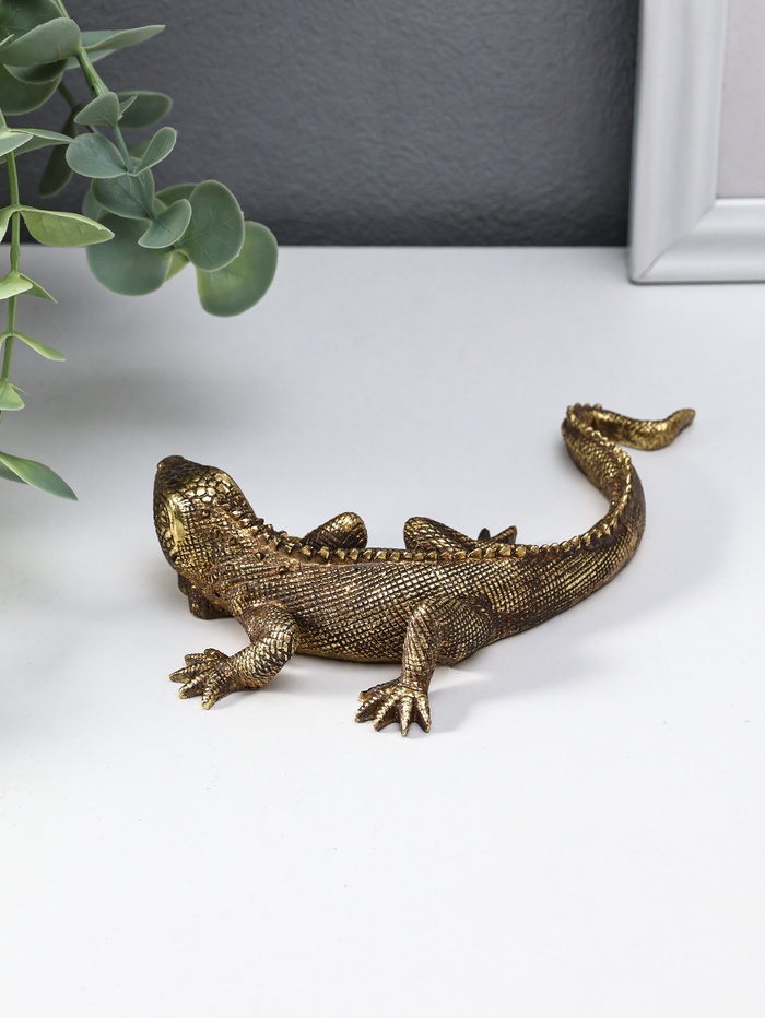 Эта золотистая игуана из полистоуна — изящный акцент для интерьера или значимый подарок. Её облик, отточенный до мельчайших чешуек, застыл в благородном позолоченном силуэте. Статуэтка передает спокойную мощь и древнюю мудерость этого удивительного создания, привнося в пространство дух тропических саванн и экзотических путешествий.