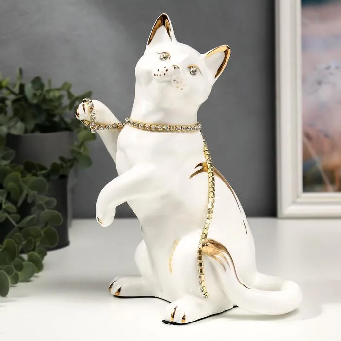 Сувенир керамика "Белая кошечка с ожерельем" с золотом, стразы 10,2 см