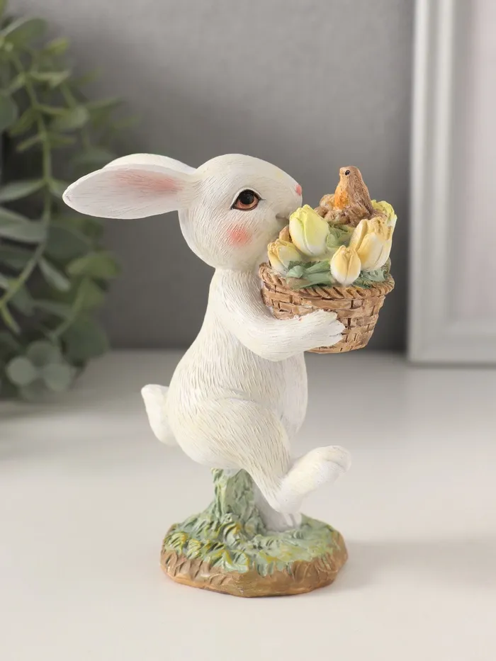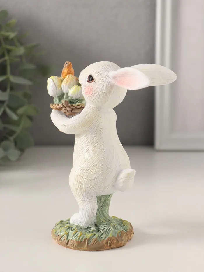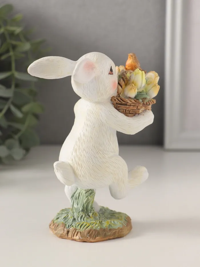 Фигурка полистоун «Кролик с птичкой в корзинке с тюльпанами», 9×5.5×12 см — Характеристики