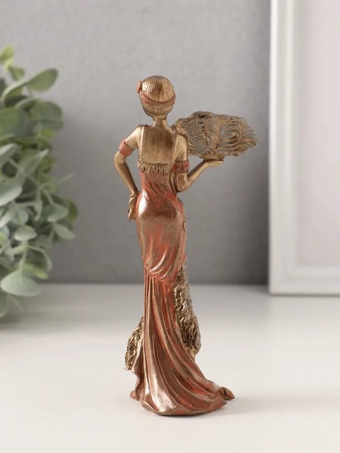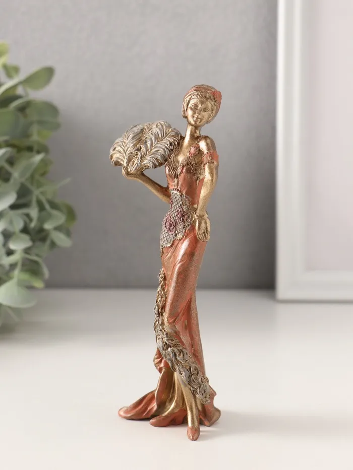 Почувствуйте очарование эпохи джаза с нашей «Фигуркой леди в платье 20-30 годов». Эта изящная статуэтка из полистоуна передает атмосферу Арт-Деко, изображая элегантную даму с роскошным страусиным веером.