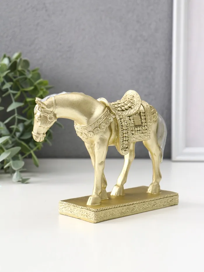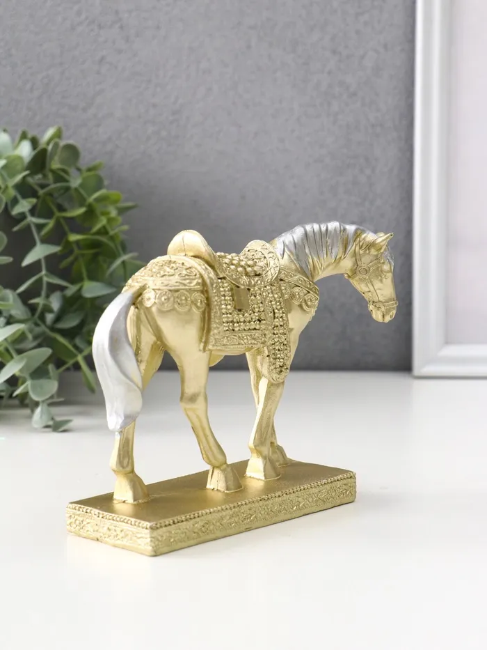 Фигурка изготовлена из высококачественного полистоуна, что обеспечивает её долговечность и устойчивость к повреждениям. Её размеры (15×4.8×11.5 см) делают её удобной для размещения на полках, столах или каминных зонах, где она будет привлекать восхищённые взгляды. Золотистое тело лошади дополнено серебристой гривой и узорным седлом, создавая гармоничный контраст, который подчеркивает мастерство исполнения.