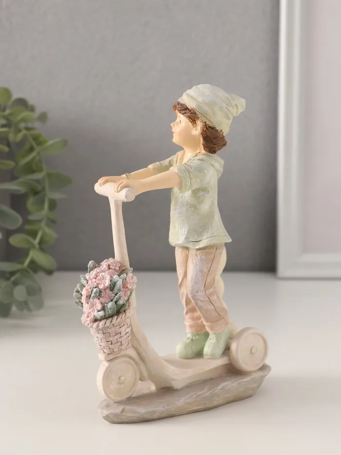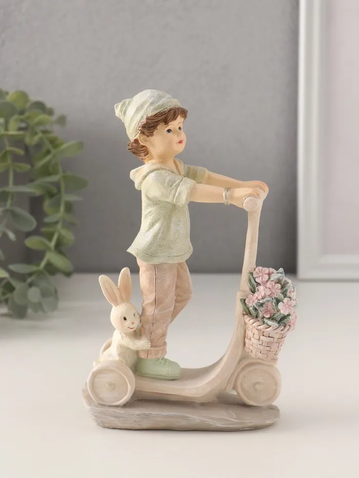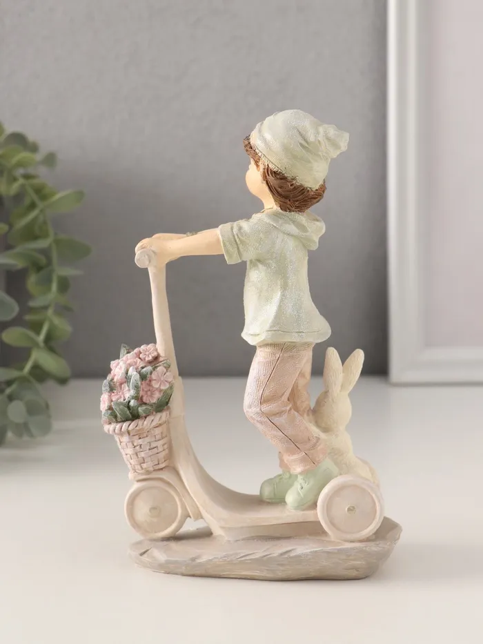 Фигурка полистоун «Мальчишка на самокате, с кроликом и корзиной цветов», 11.5×4.5×16.5 см — Характеристики