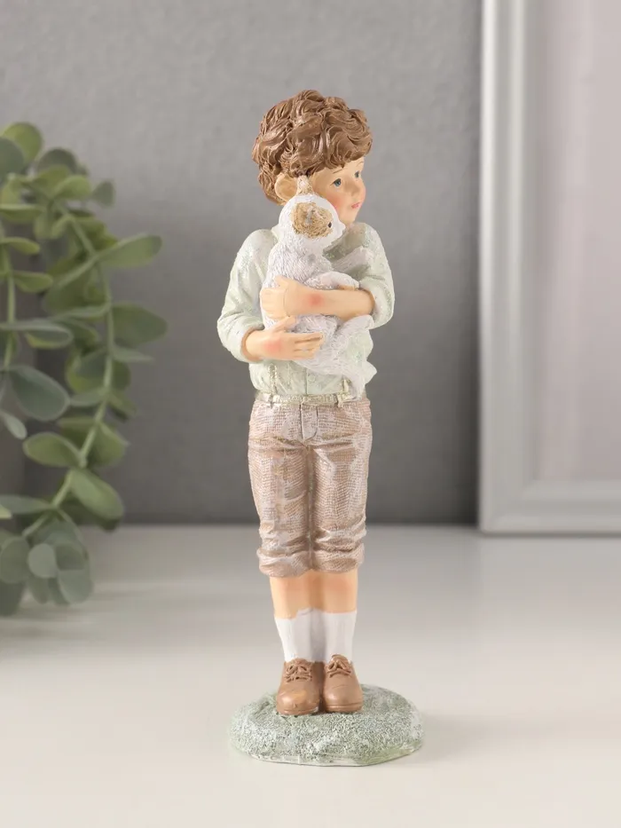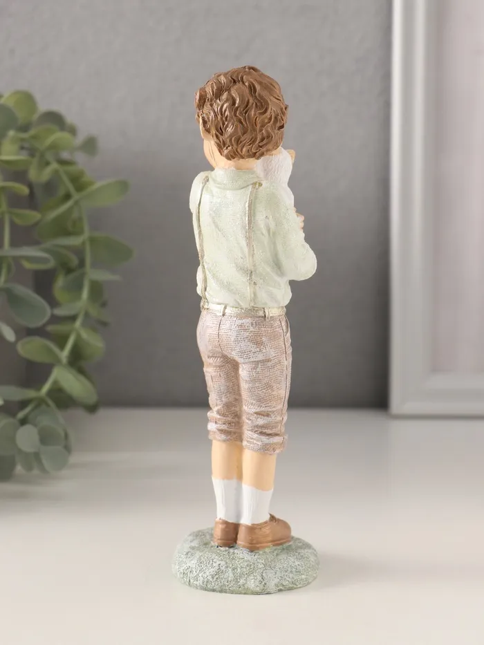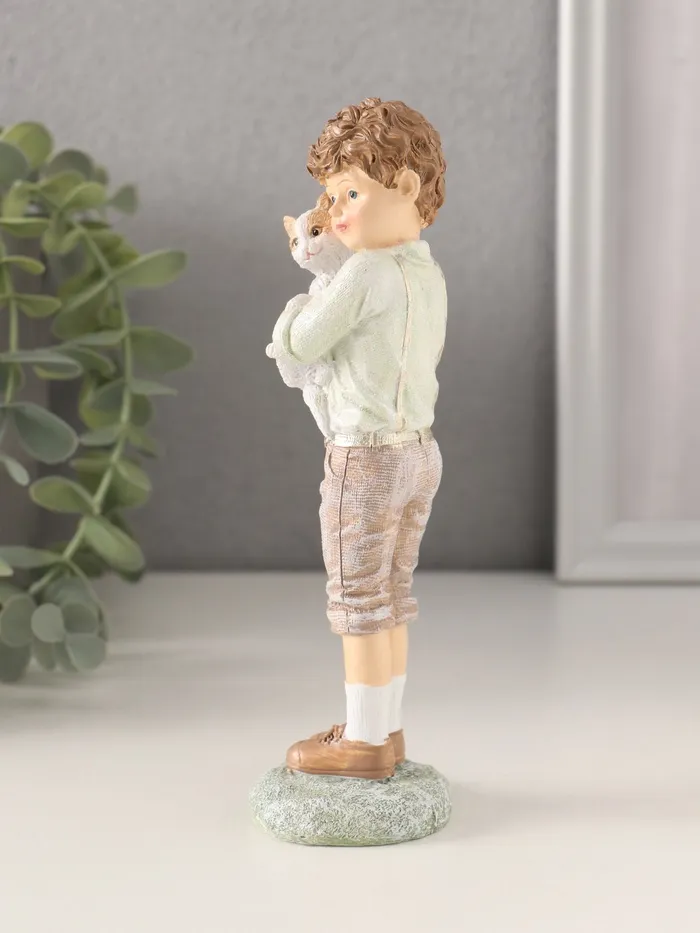 Фигурка полистоун «Мальчишка с котёнком», розово-зелёный, 5×4.5×16 см — Характеристики