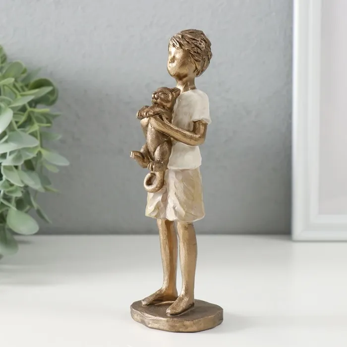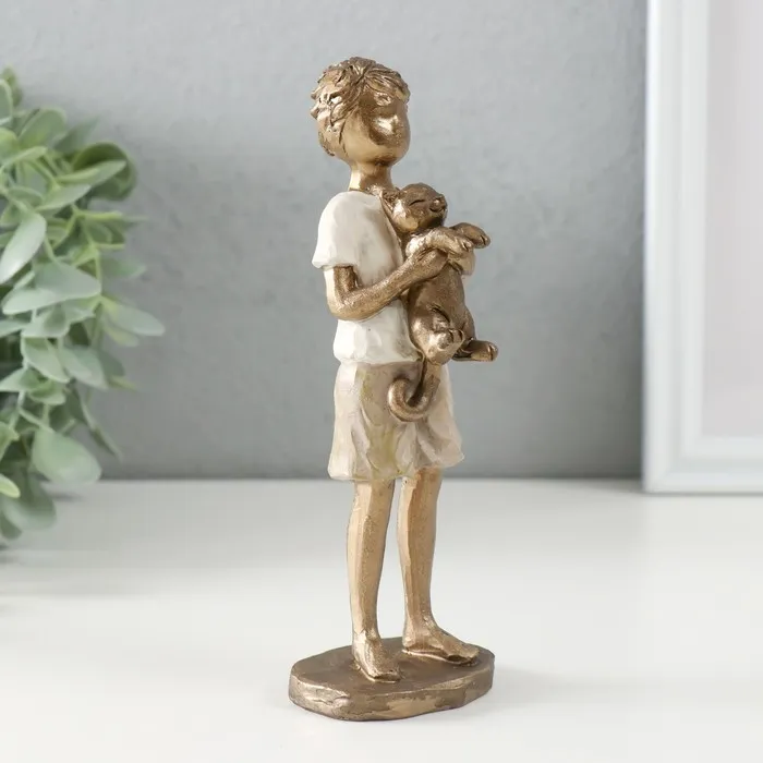 Фигура выполнена из полистоуна — материала, сочетающего прочность и благородство камня с лёгкостью обработки. Поверхность покрыта краской золотистого оттенка с эффектом старения, создающим впечатление бронзовой антикварной скульптуры. Образ мальчишки, держащего кота, пропитан нежностью и естественностью — будто момент жизни, пойманный на лету. Размеры (5.5×5.5×16.5 см) делают изделие удобным для размещения как самостоятельного акцента в комнате, так и в составе композиции.