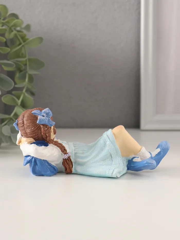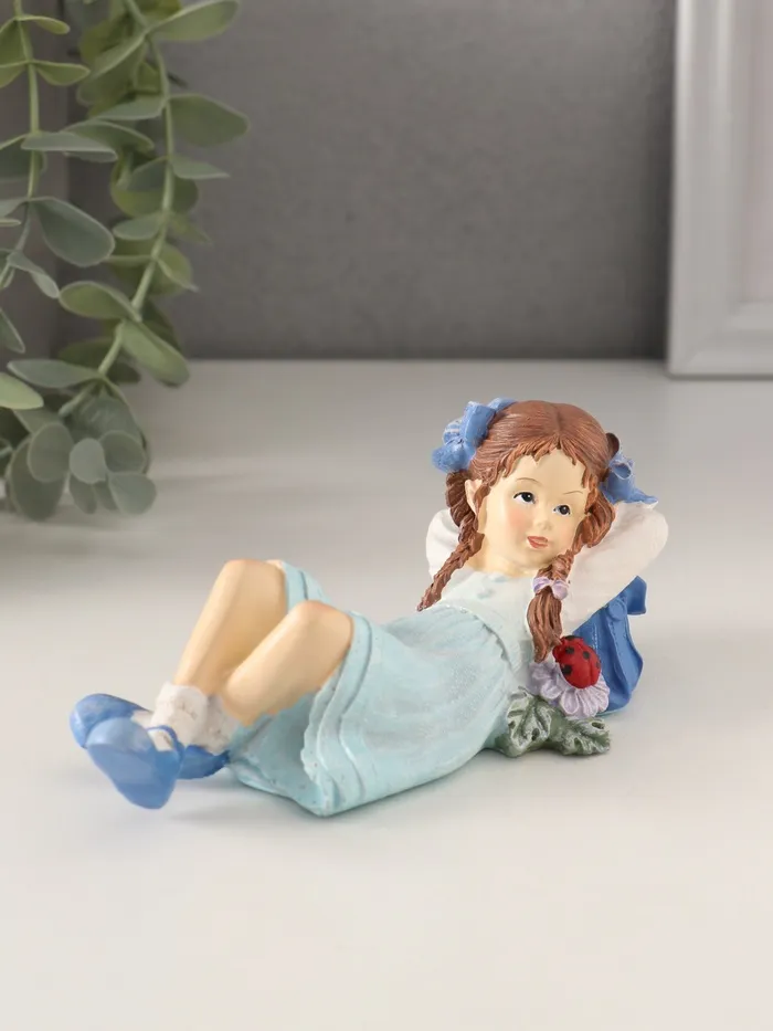 Фигурка изображает малышку, лежащую на полянке с рюкзаком, что создаёт трогательную и умиротворяющую композицию. Нежные голубые оттенки придают изделию лёгкость и свежесть, напоминая о тёплых летних днях. Её компактные размеры позволяют легко разместить её на полке, столе или в витрине, добавляя пространству тепла и гармонии.