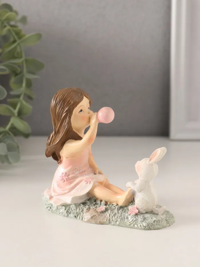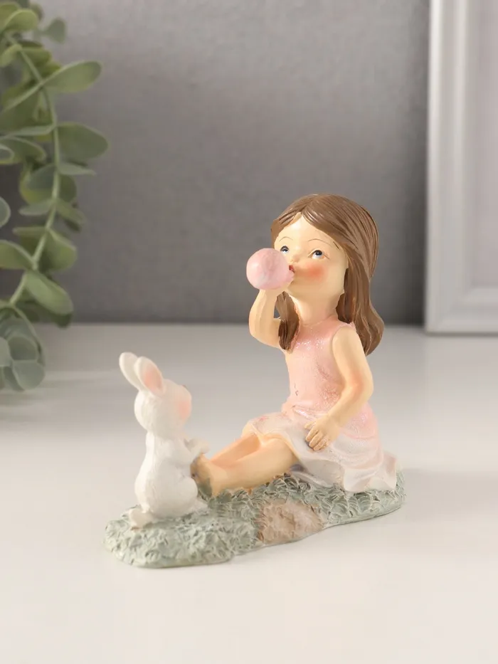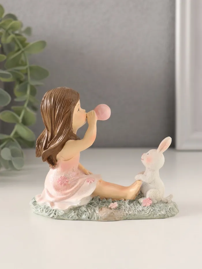 Фигурка полистоун «Малышка надувает шарик, с зайчиком на лужайке», розовый, 10.5×5×9 см — Характеристики