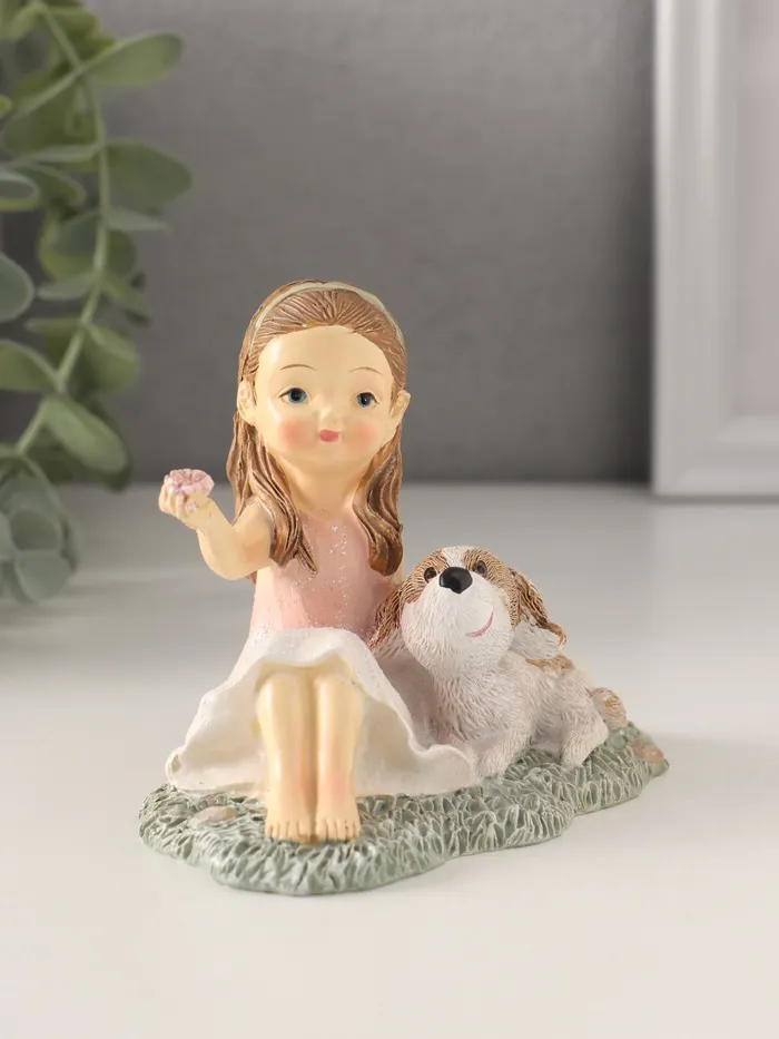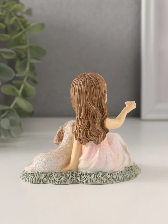 Фигурка изображает малышку в розовом платье, играющую с собачкой на лужайке, что подчёркивает её невинность и любовь к животным. Разноцветные акценты добавляют образу яркости и изысканности, делая её универсальным элементом декора. Её компактные размеры (10×6,5×8,5 см) позволяют легко разместить её на полке, столе или в витрине, где она будет радовать глаз и вдохновлять.