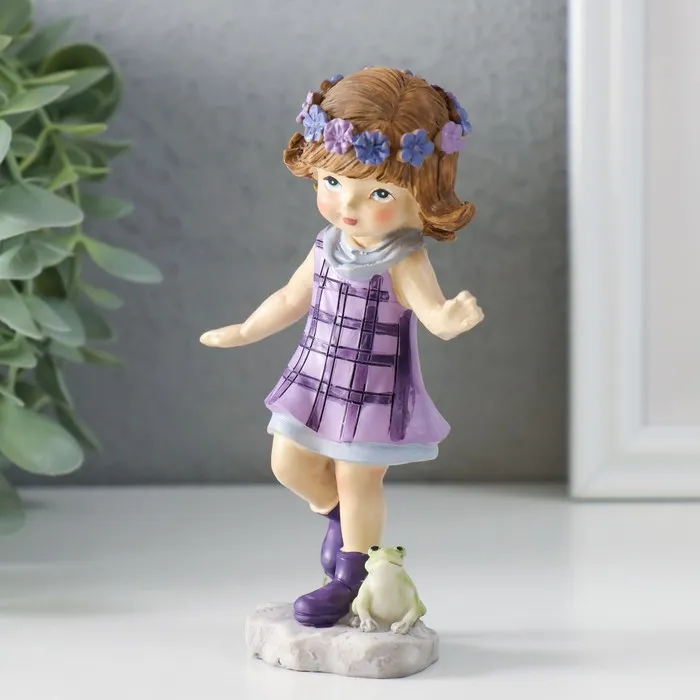 Очаровательная деталь для вашего интерьера! Фигурка девочки с лягушками из полистоуна — это трогательная сценка в сиренево-клетчатом платье, которая добавит уюта в детскую или станет милым подарком.