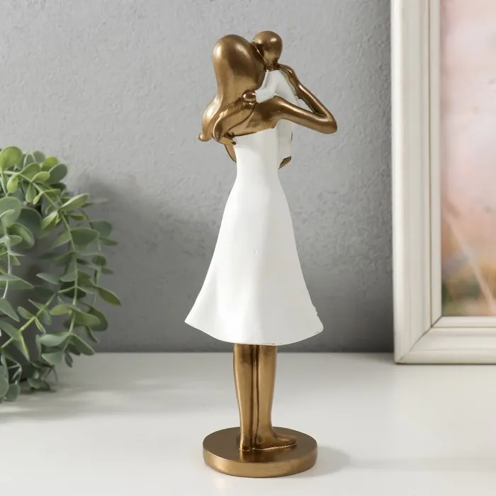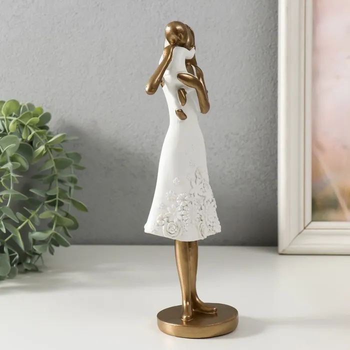 Эта изящная фигурка высотой 23,5 см — трогательное воплощение материнской любви и нежности. Мама в белом платье с цветочным узором, нежно обнимающая ребёнка, создаёт атмосферу тепла и семейного уюта, которая украсит любой интерьер.