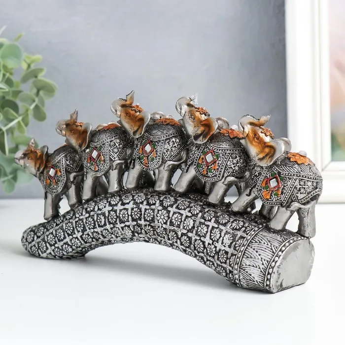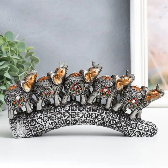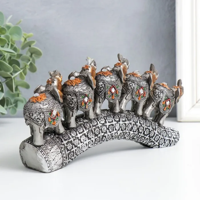 Фигурка полистоун «Пять слонов на бивне с цветами», серебро, 20.5×4×11 см — Характеристики