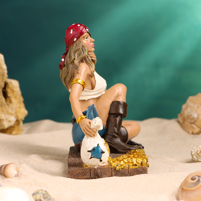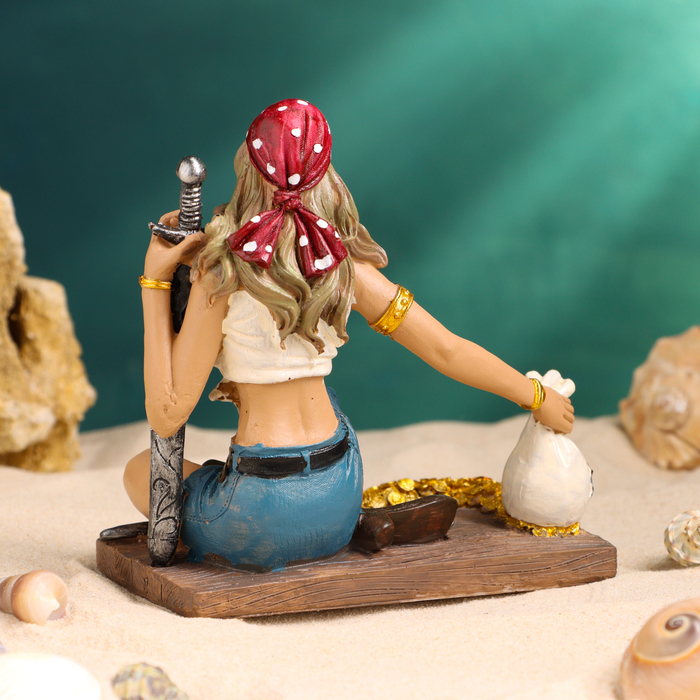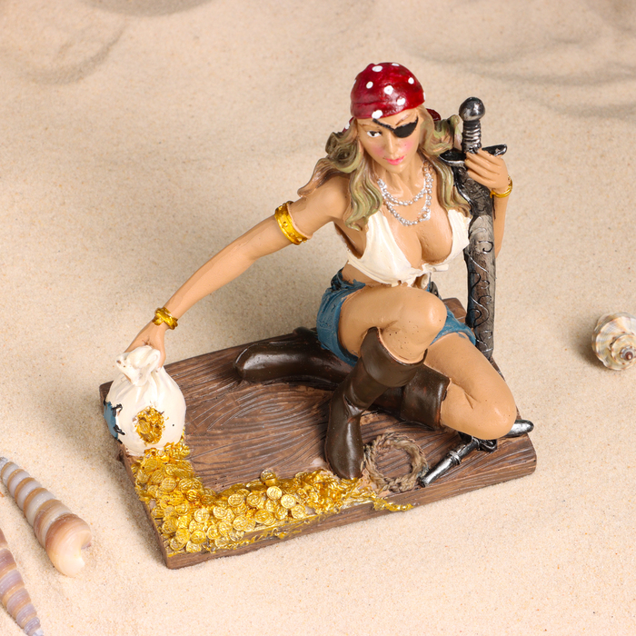 Эта пиратская фигурка из полистоуна станет характерным акцентом в интерьере или небанальным подарком для ценителя морской романтики. Образ отважной искательницы приключений, запечатлённый в детальной скульптуре, привносит дух свободы и тёплый шарм ручной работы в любое пространство.