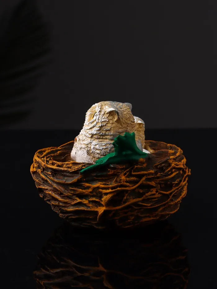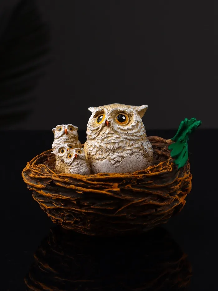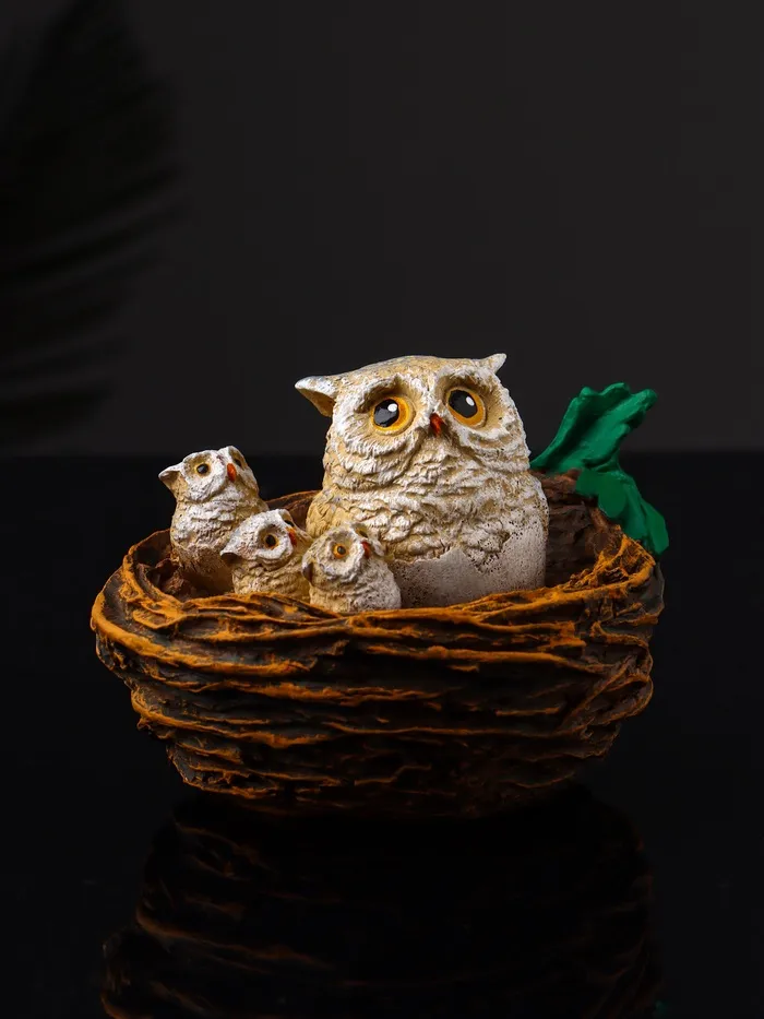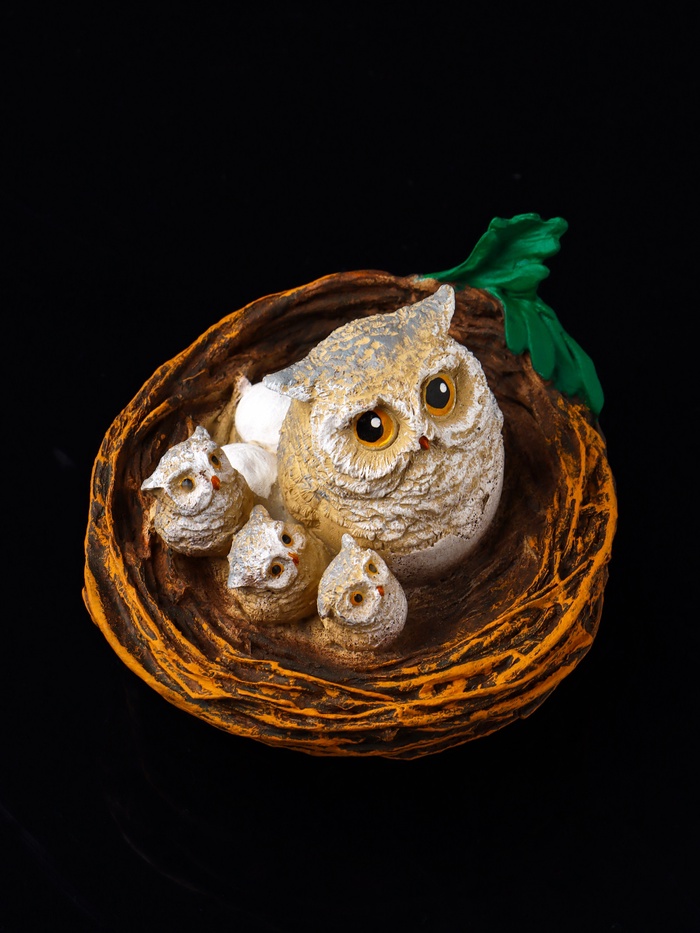 Фигурка выполнена из полистоуна — материала, который славится своей прочностью и долговечностью. Коричнево-разноцветная палитра подчеркивает естественность образа: от текстуры древесины гнезда до мягких перьев сов. Каждая деталь проработана с особой тщательностью, что делает эту композицию настоящим произведением искусства. Благодаря своим компактным размерам она легко разместится на полке, камине или рабочем столе, не занимая много места.