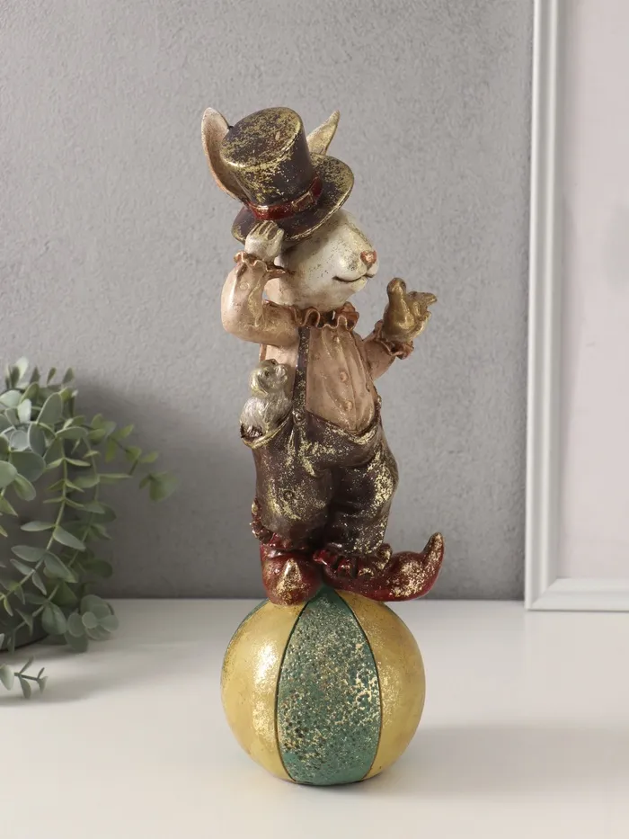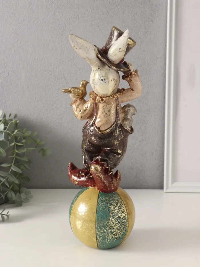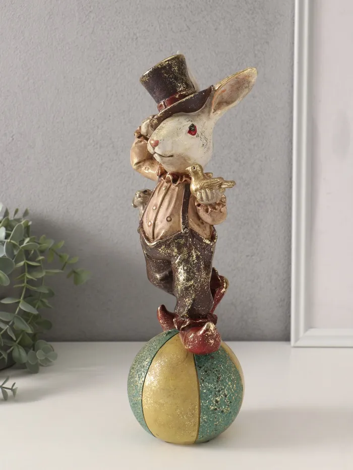 Представляем вашему вниманию яркую и динамичную композицию, которая привнесёт в ваш интерьер нотку циркового очарования. Кролик на шаре высотой 35 см — это символ ловкости, изящества и веселья. Разноцветное оформление и детализированная проработка делают эту фигурку не просто украшением, а настоящим произведением искусства, способным украсить любое пространство.